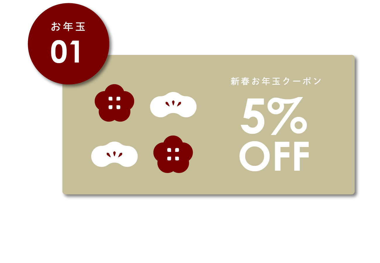 1月1日~2月1日23時59分までに商品をご購入いただいた方全員に、次回以降のお買い物でご利用いただける新春お年玉クーポンをプレゼントいたします。
