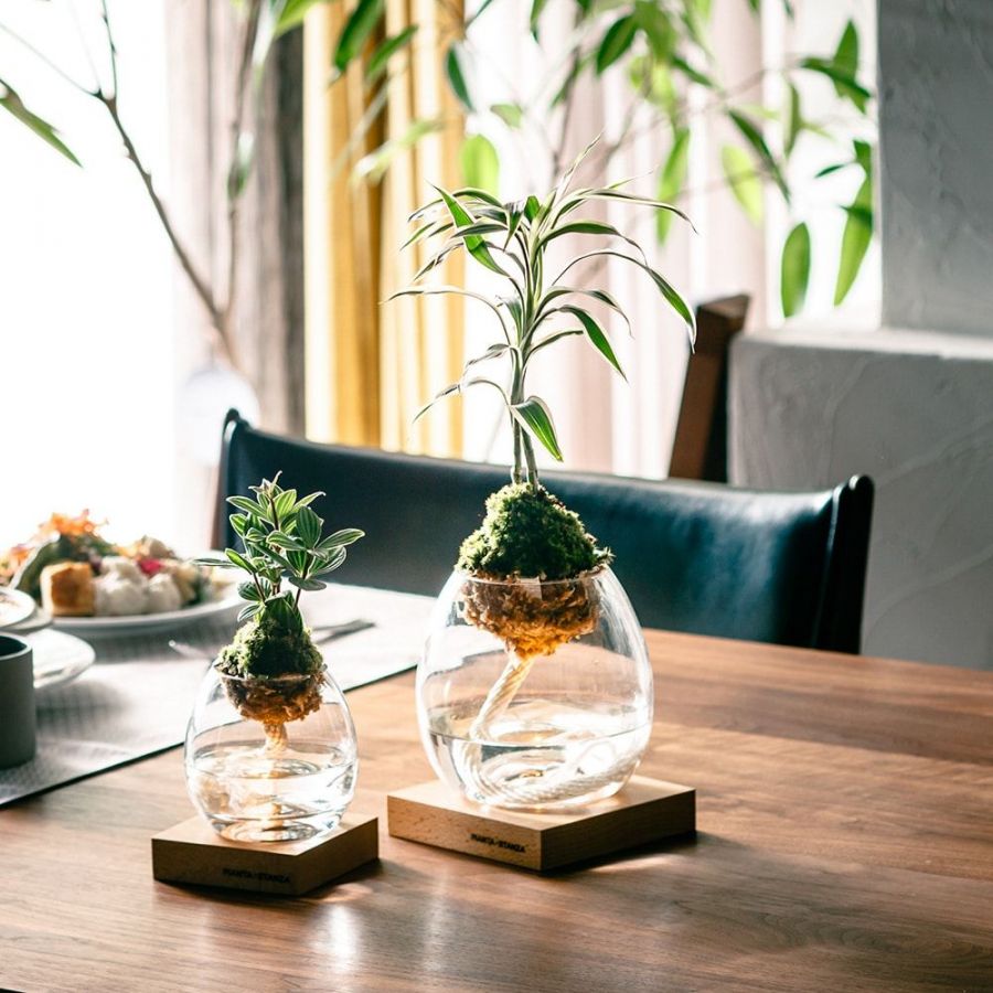 植物・苔玉・ガラスが調和した癒しのデザインで、思わず愛着が湧くかわいさ。ロープのデザインもおしゃれで、ギフトにもおすすめです。