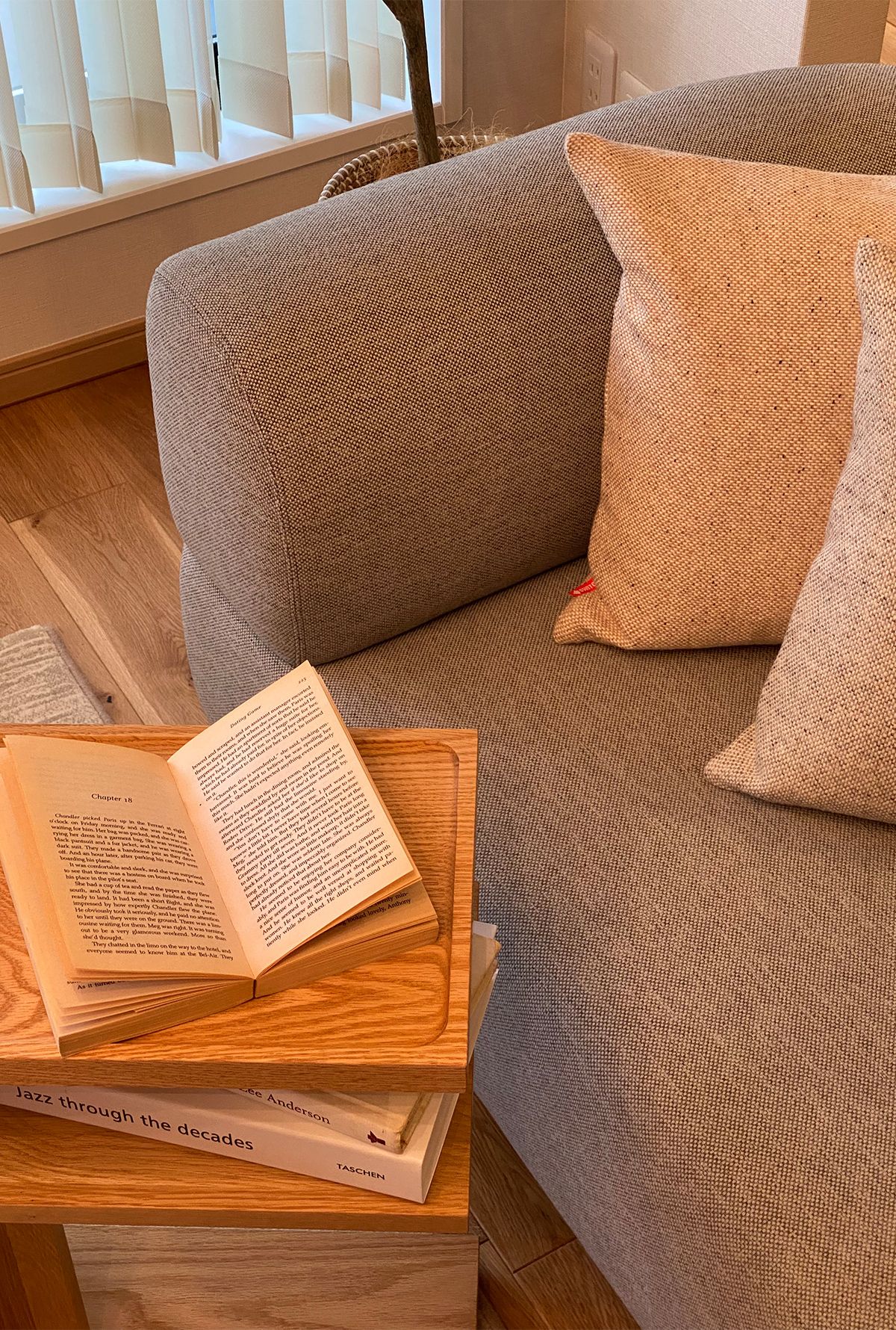 本を置いておけるので、動物の絵本がだいすきな娘ちゃんも一緒にソファに座って読んだりもして。