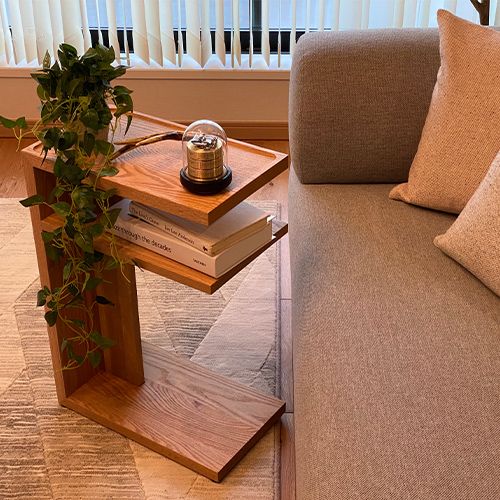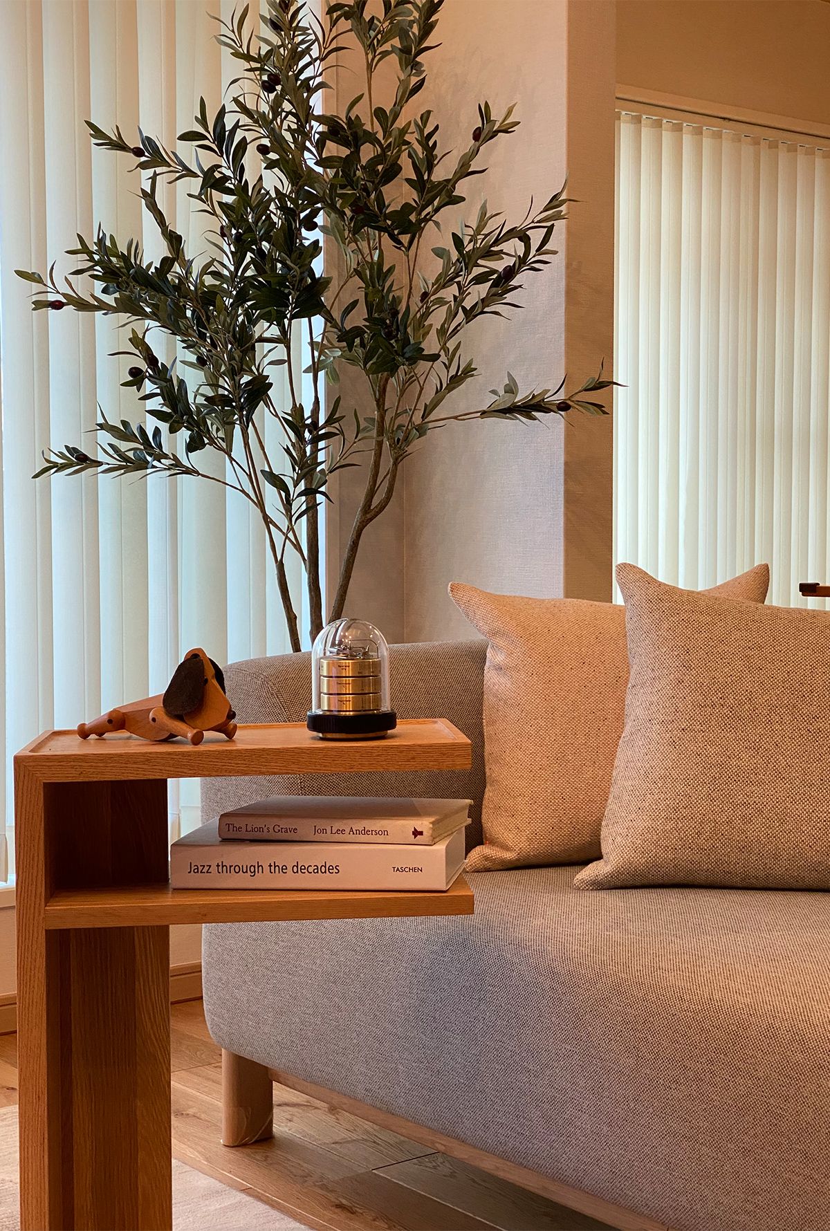 まぁるいソファにはカクカクしたサイドテーブルを。