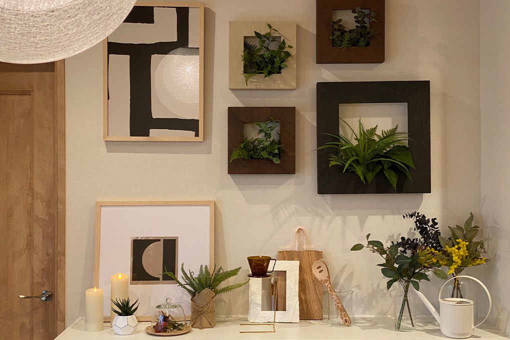 フレームの中にフェイクグリーンがプランターに植え込まれた状態で飾ることができるうえ、フェイクなのでお手入れも簡単なのも魅力的。