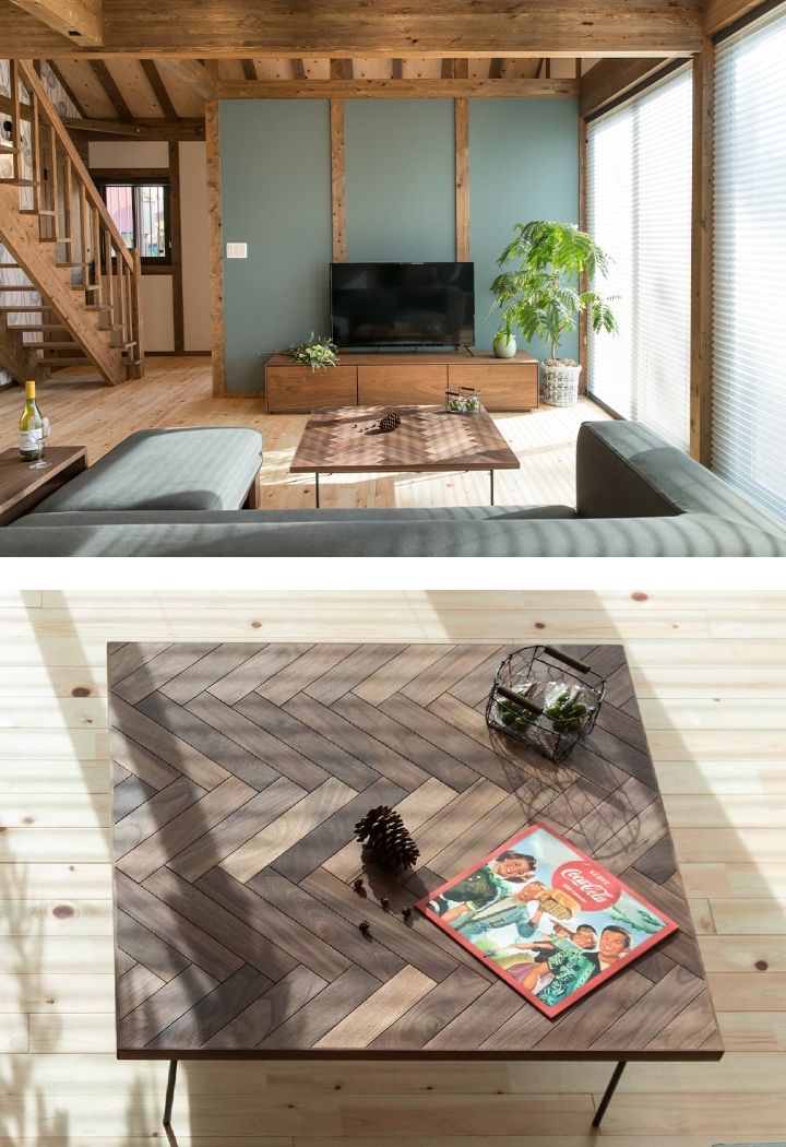 木にこだわったからこそ、リビングテーブルは”ヘリンボーン”に。