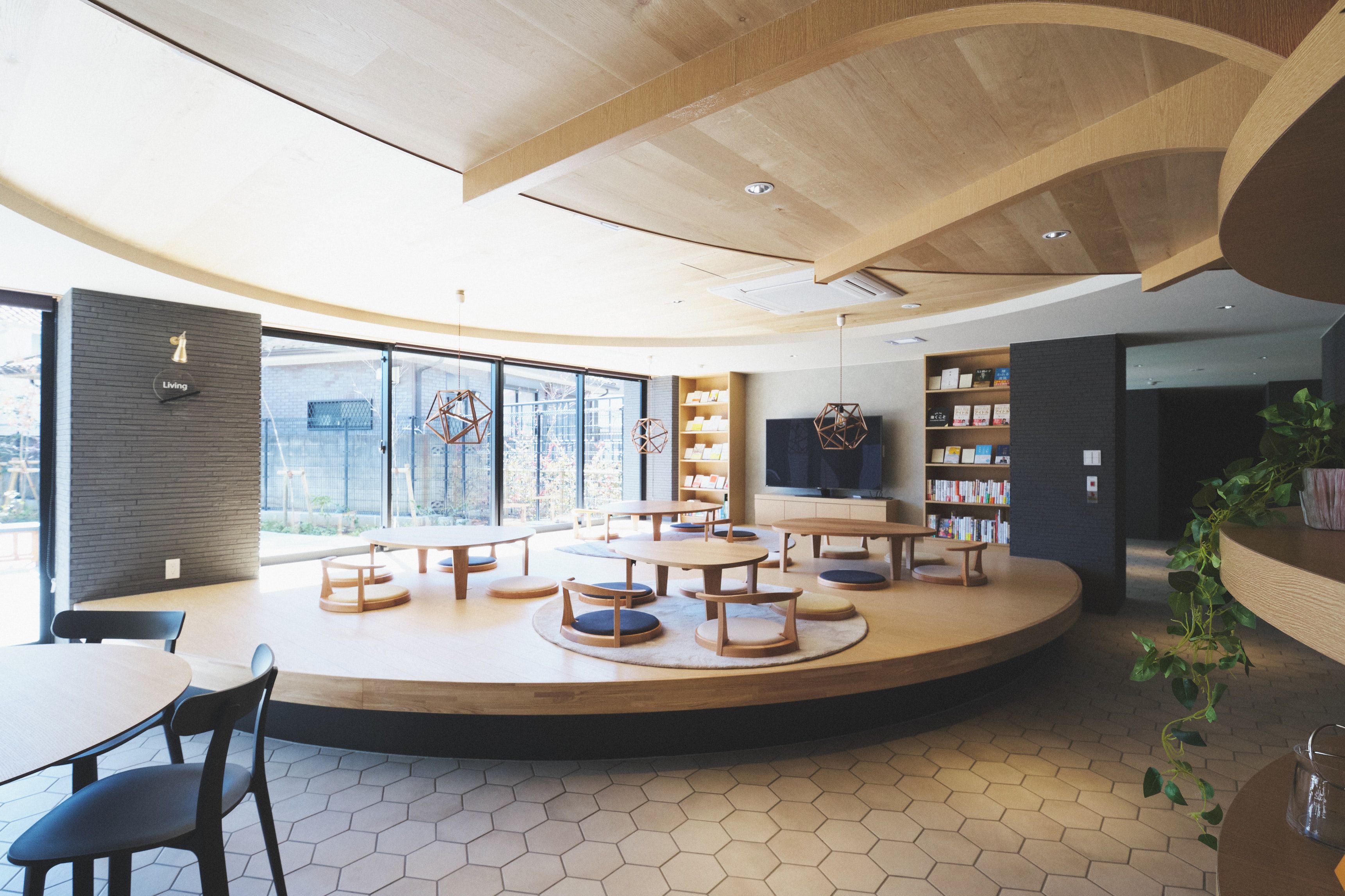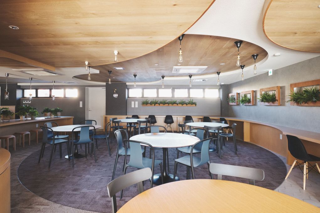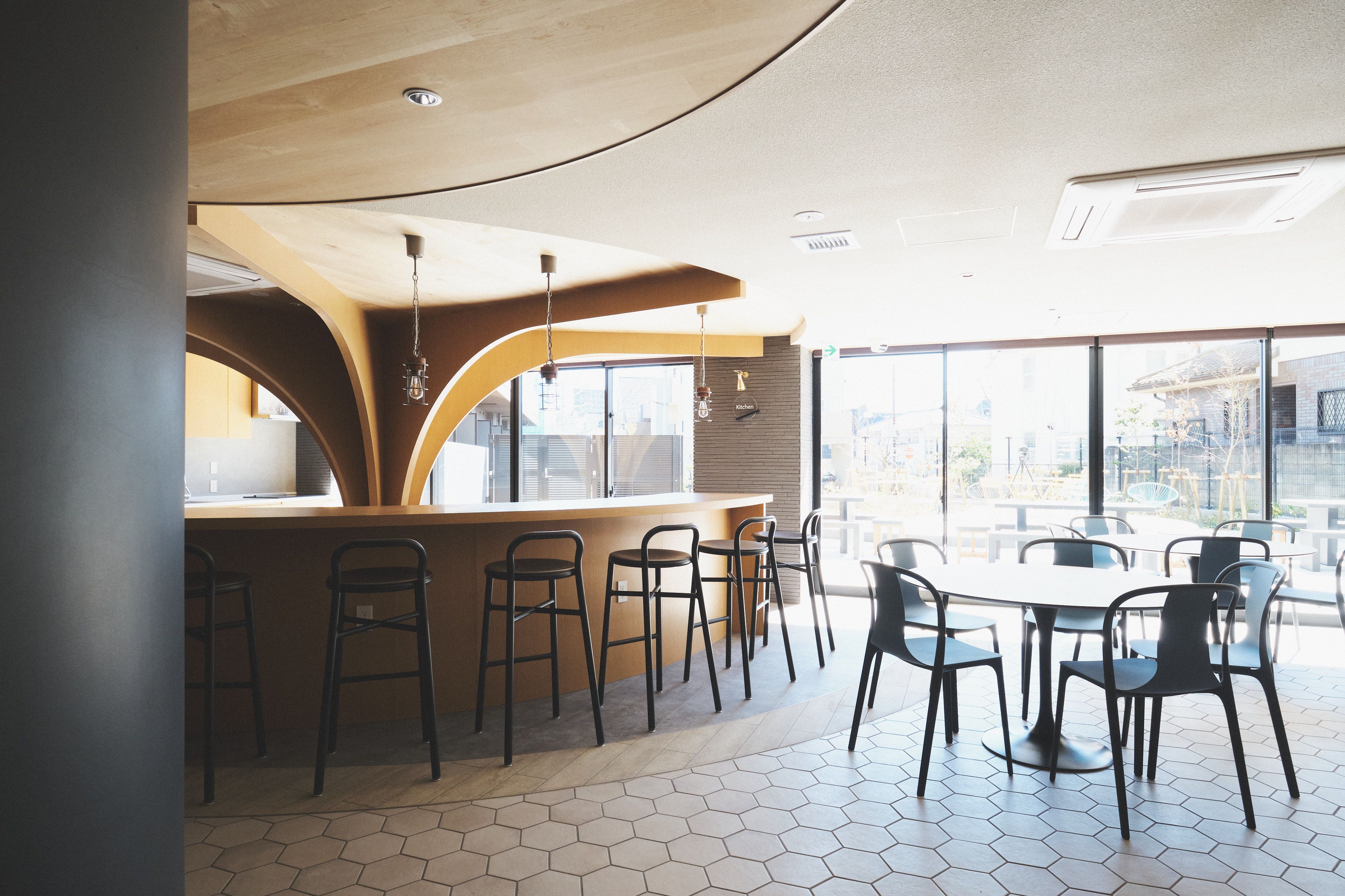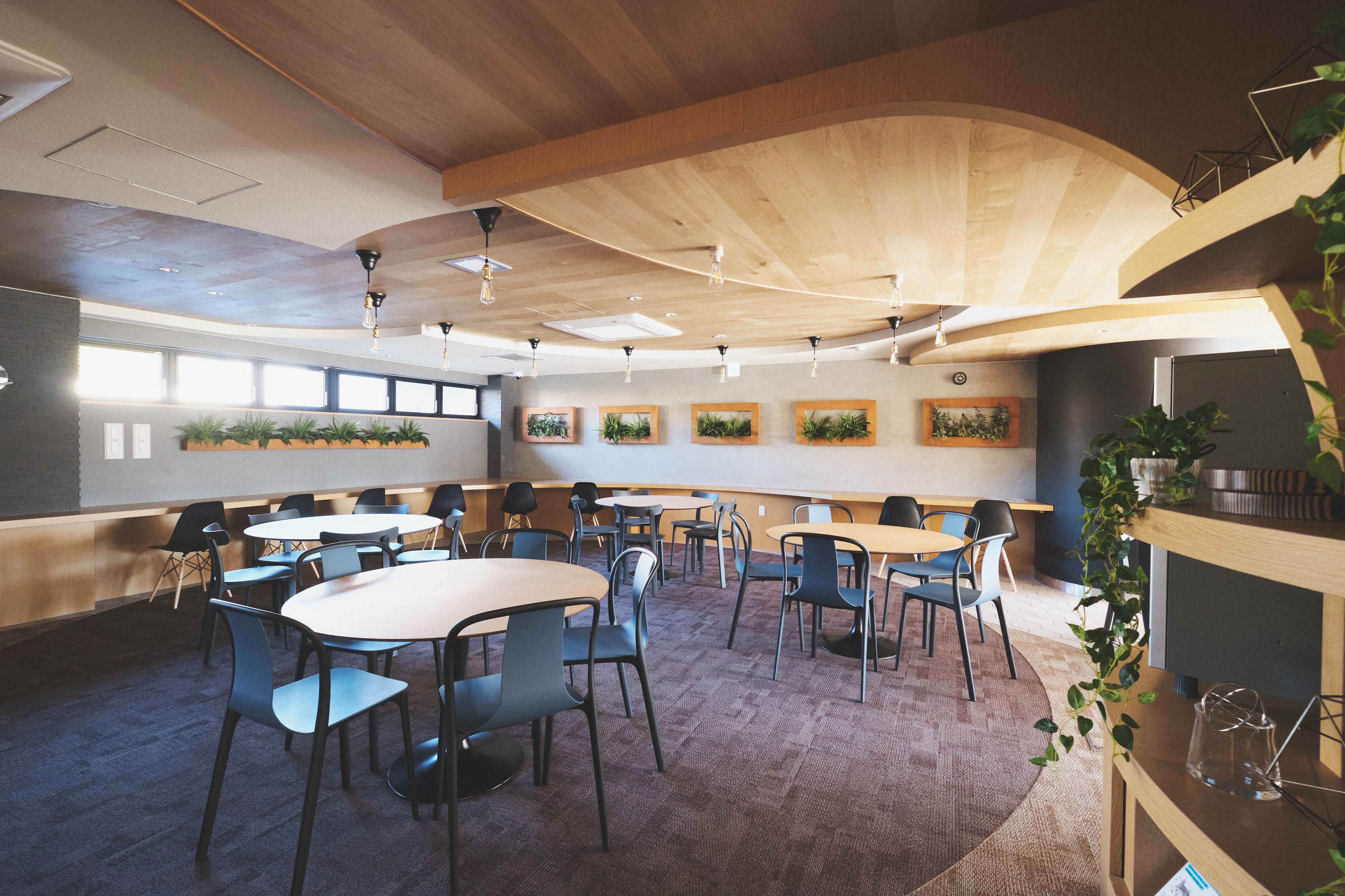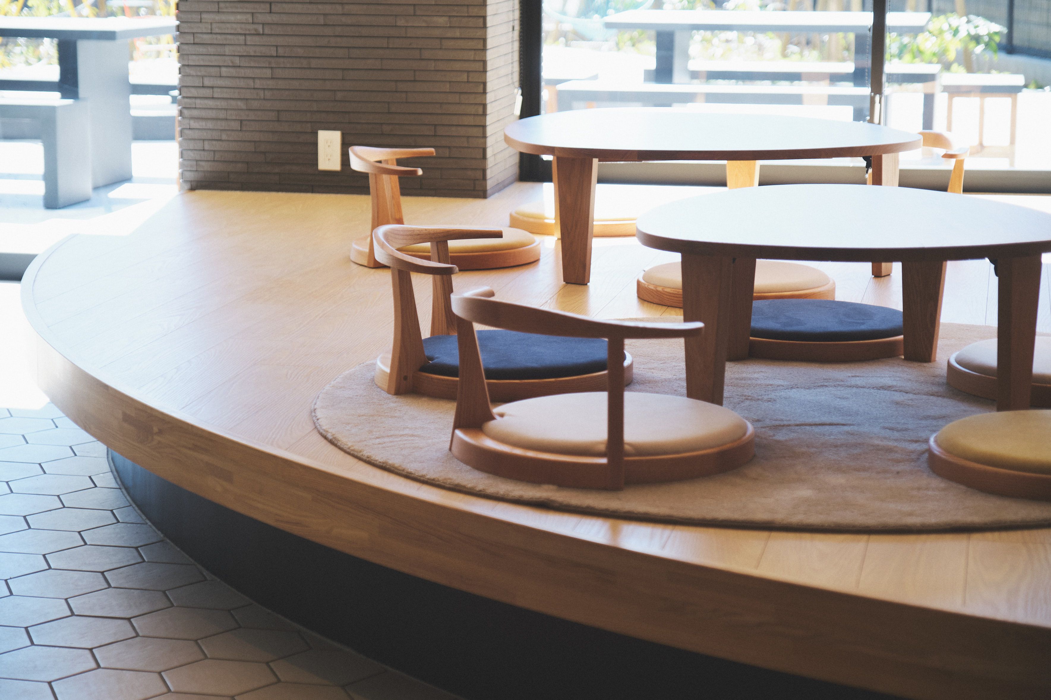 天井と床に広がるサークルのデザインに合わせて、テーブルもイスも、まぁるいアイテムでコーディネート。