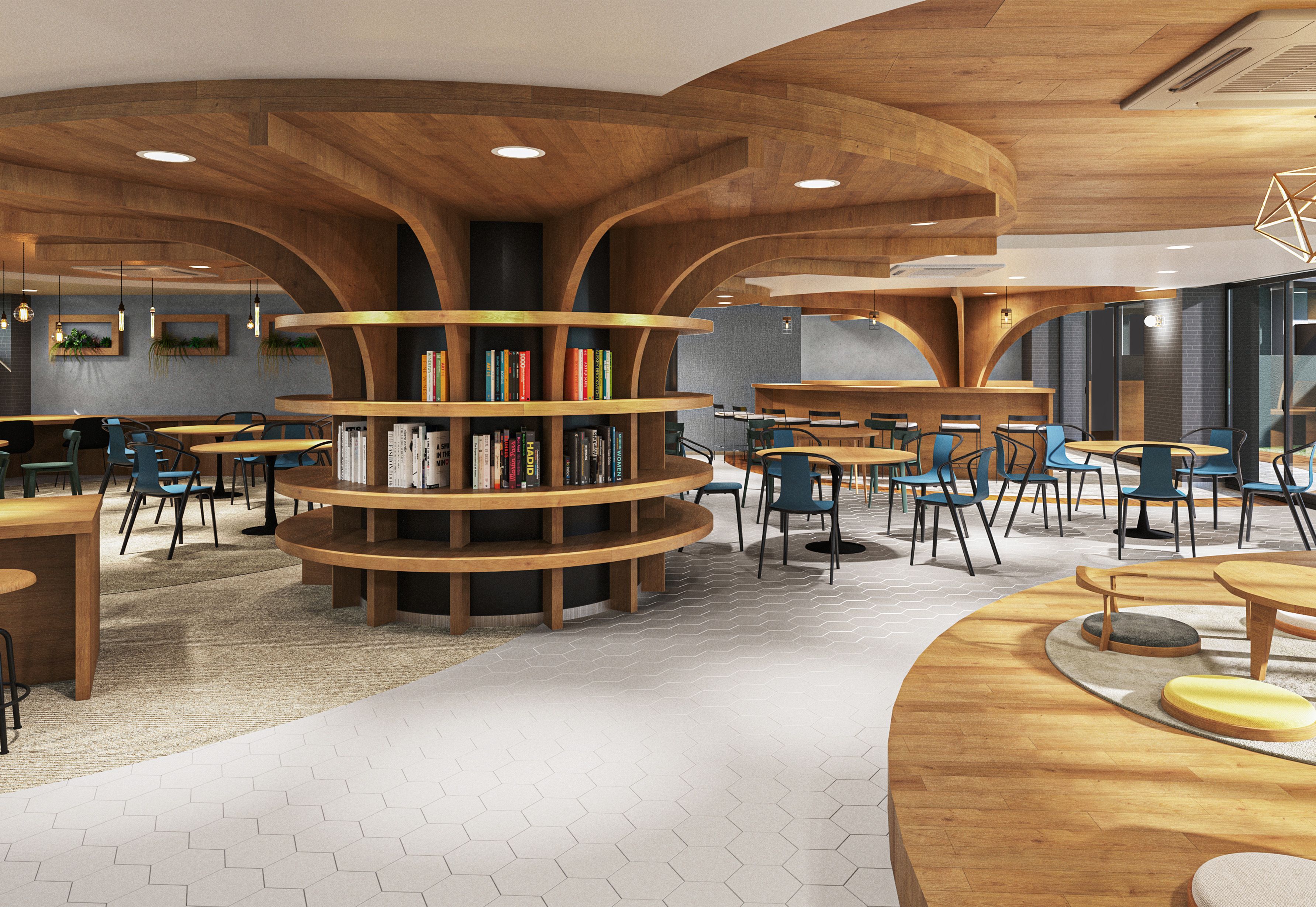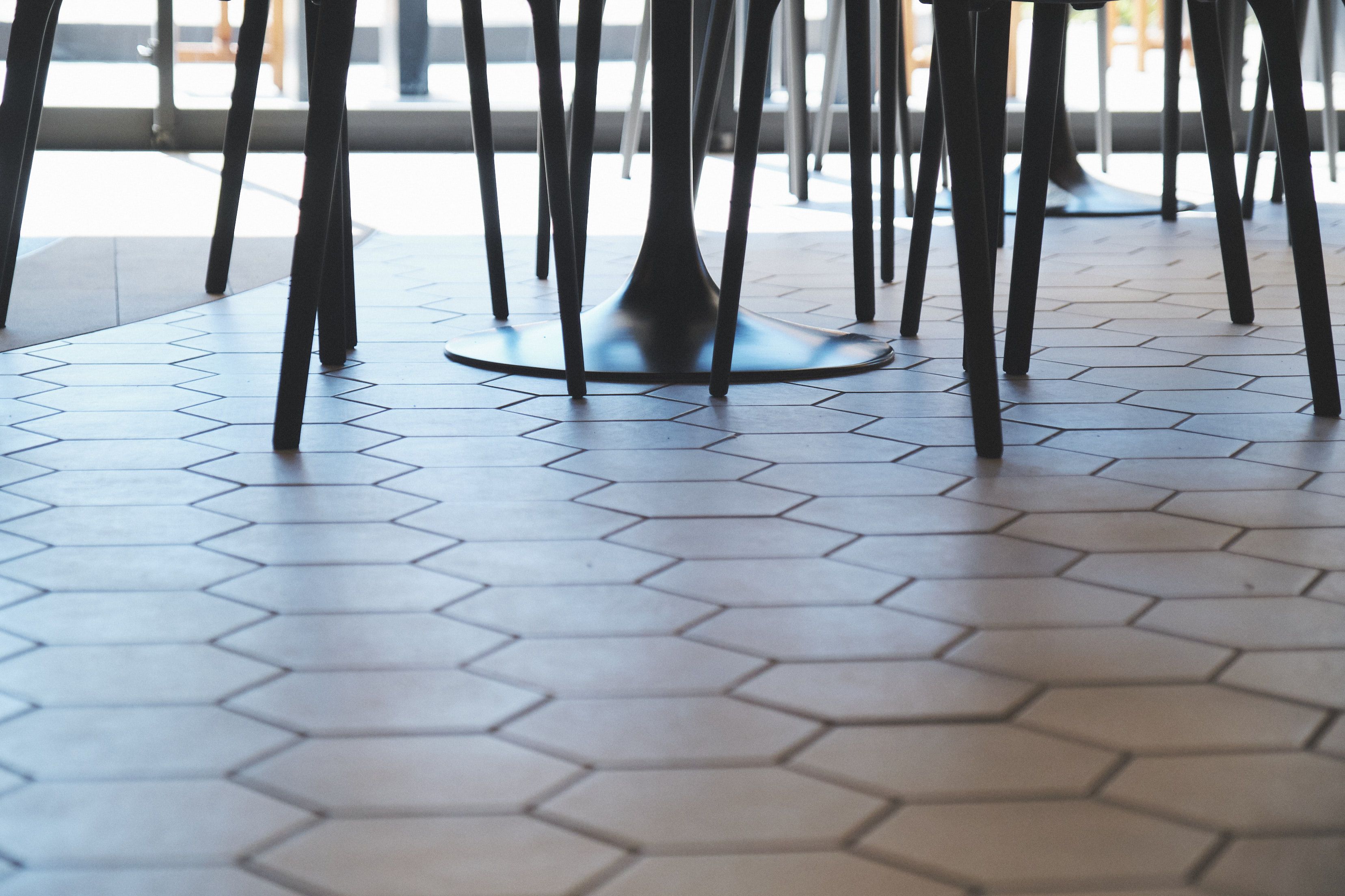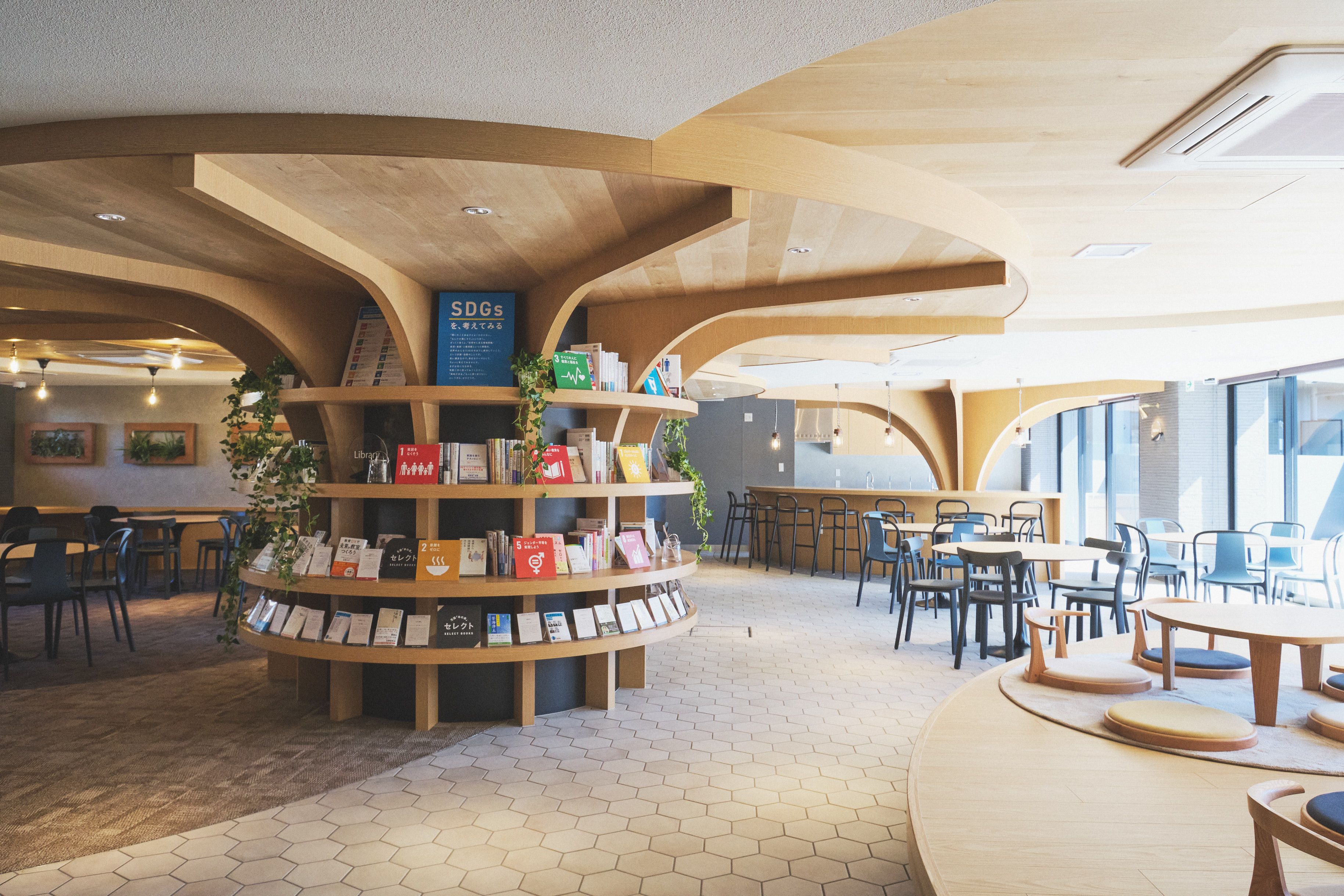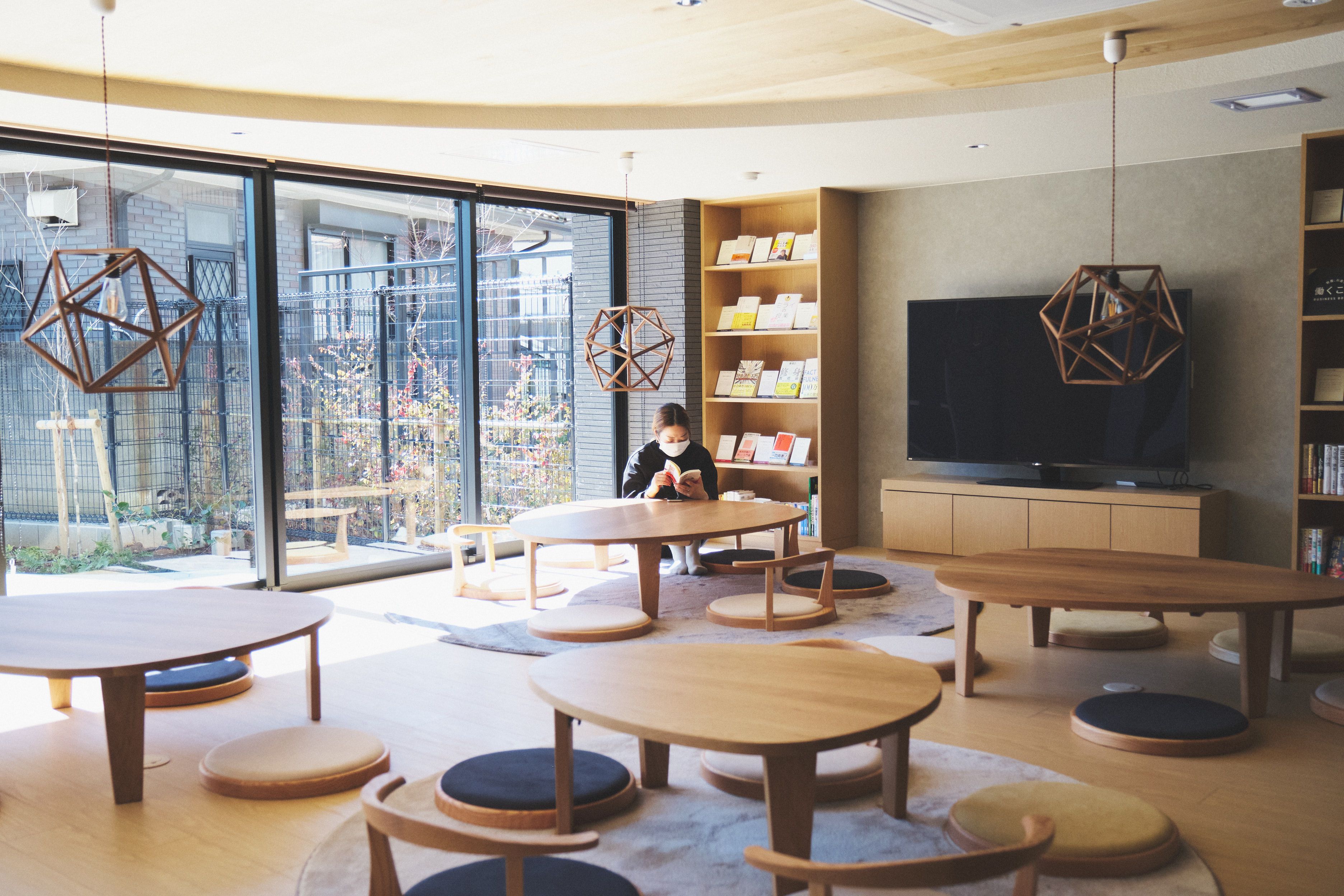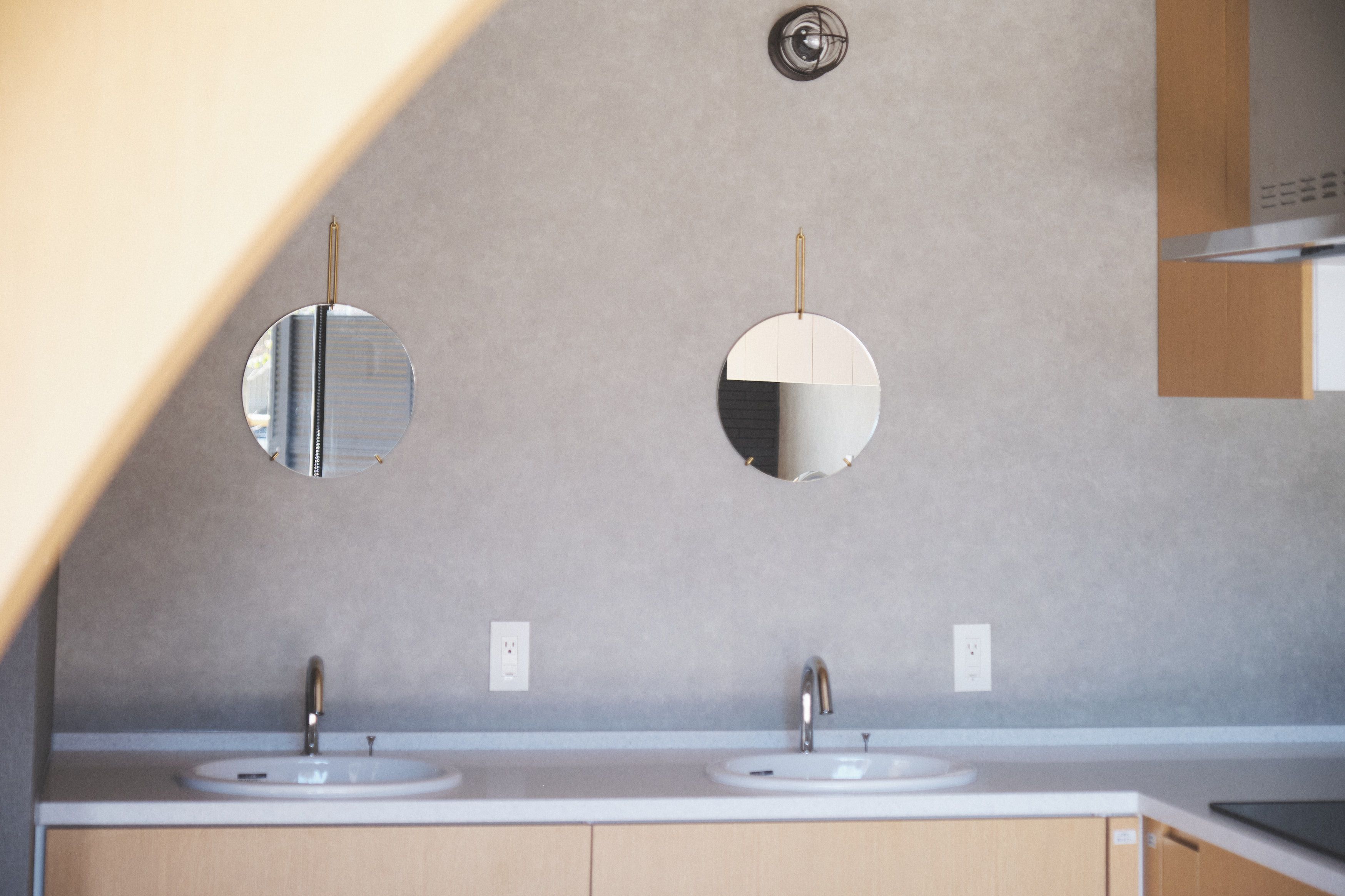 天井と床に広がるサークルのデザインに合わせて、テーブルもイスも、まぁるいアイテムでコーディネート。
