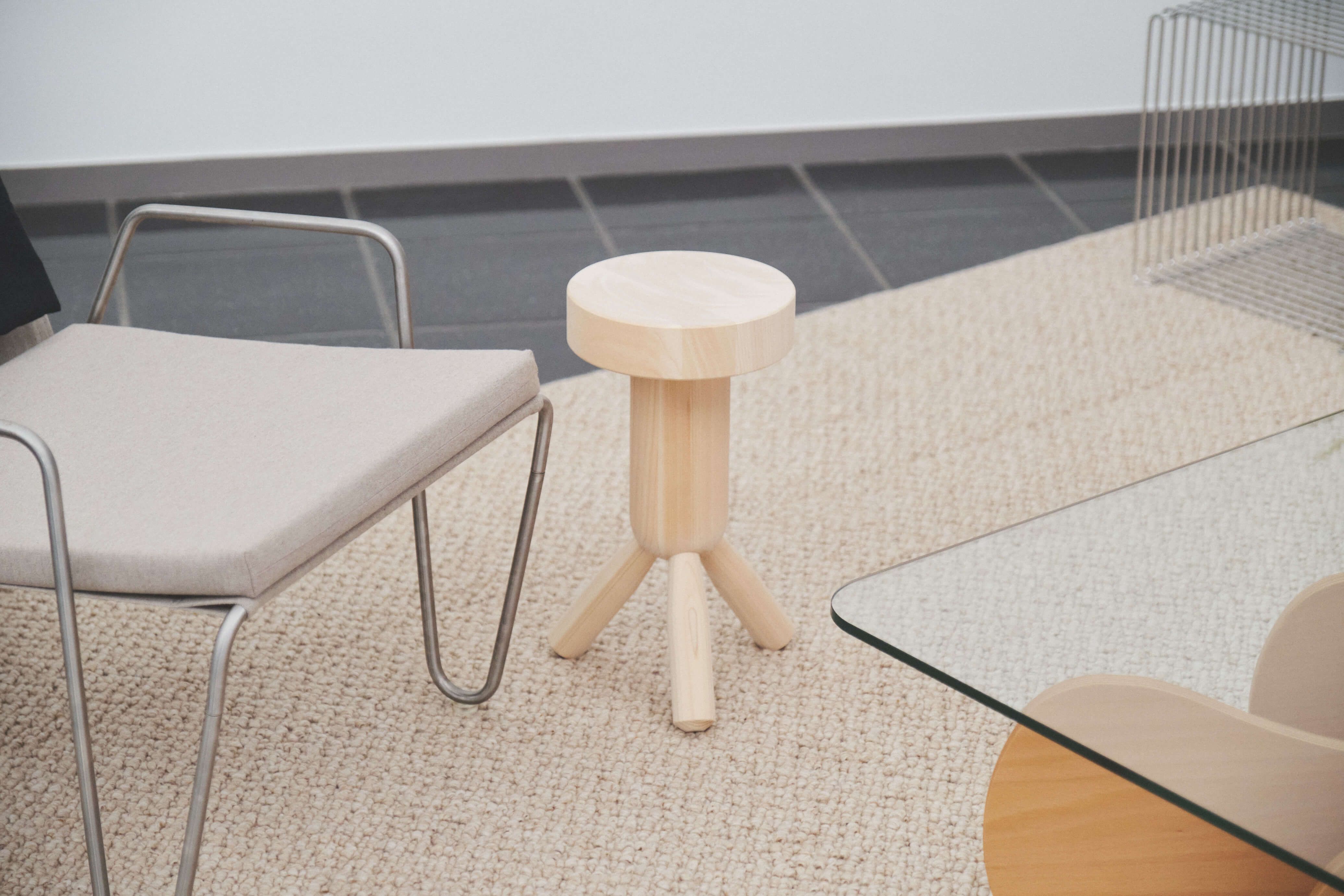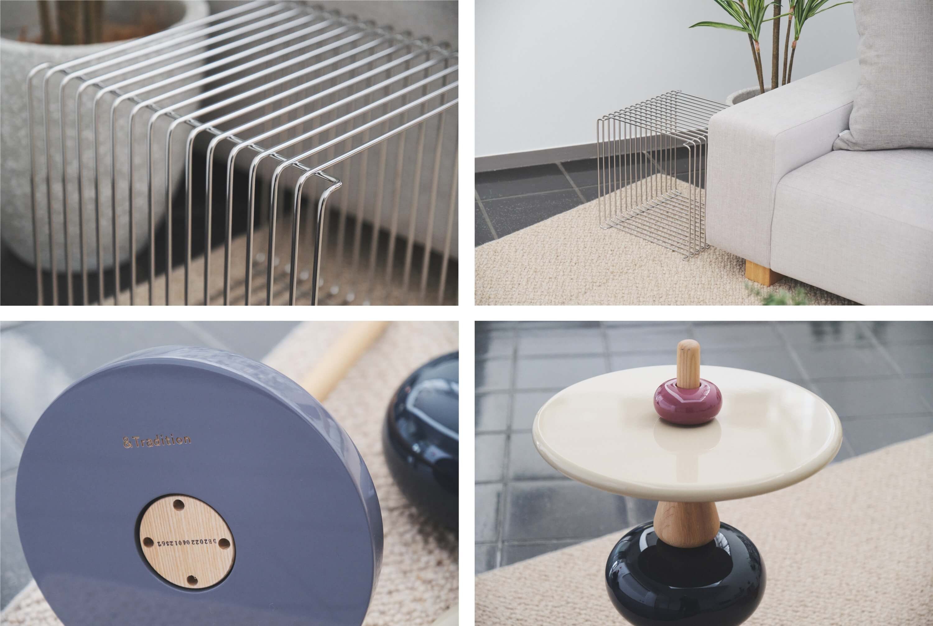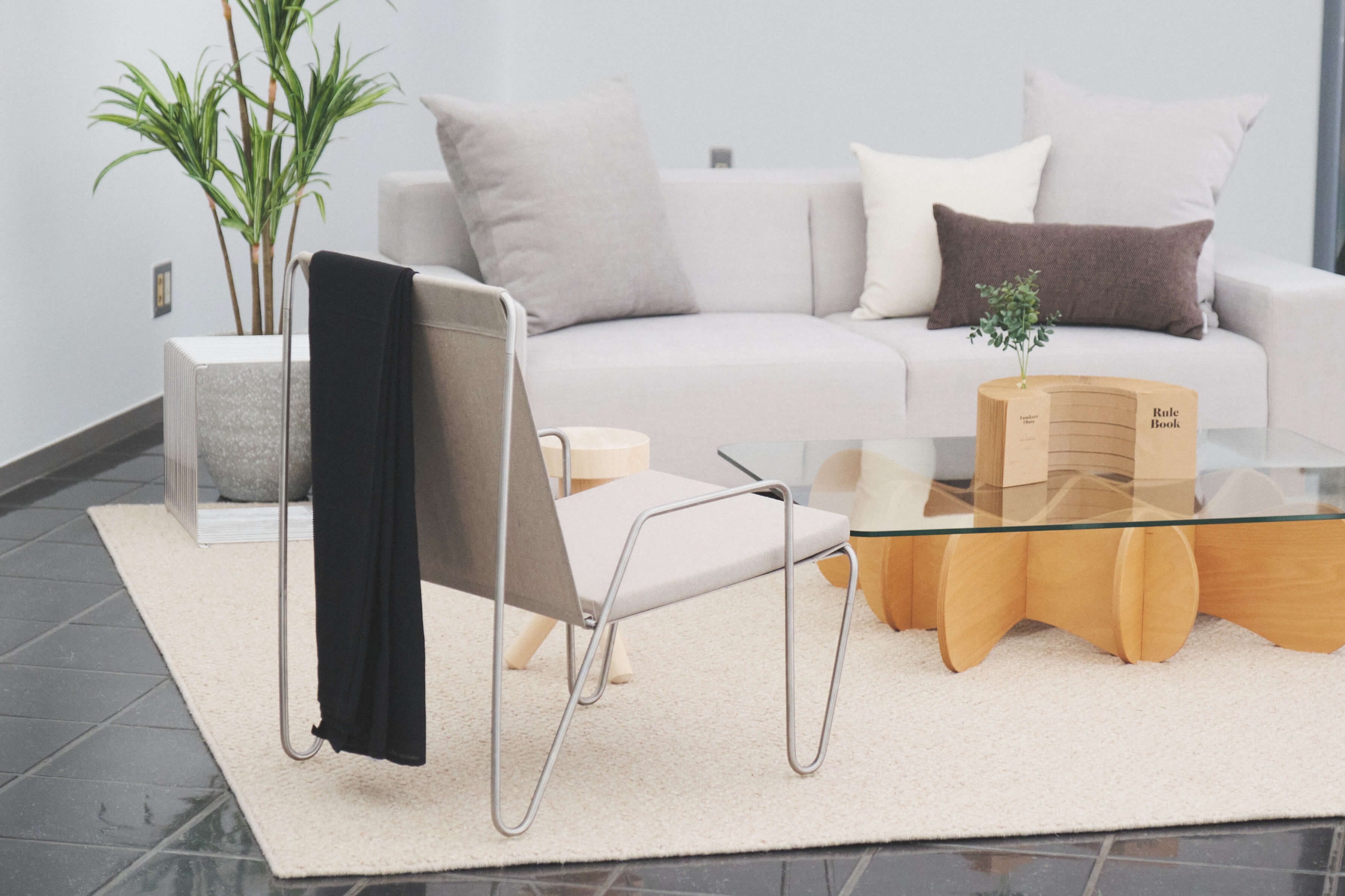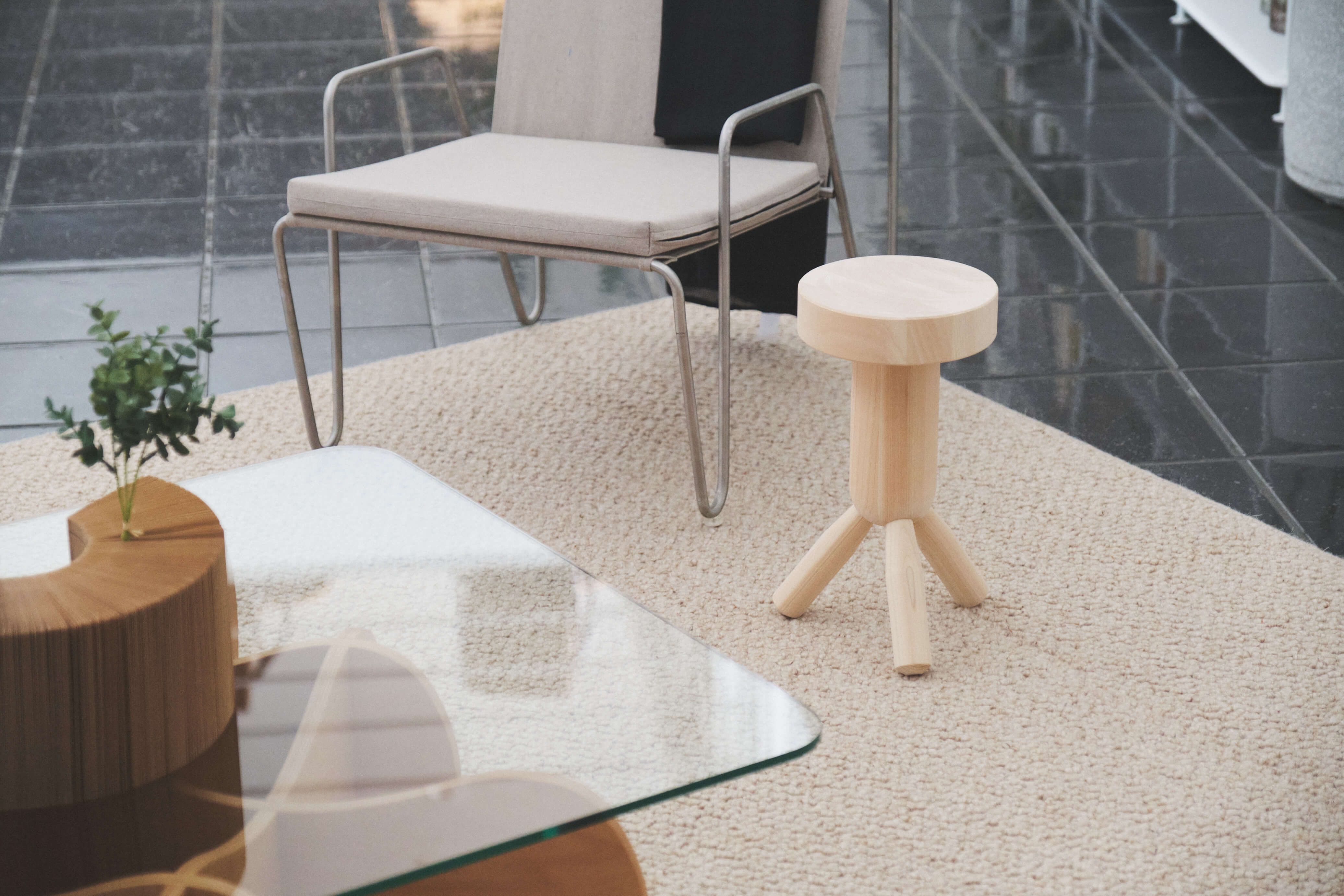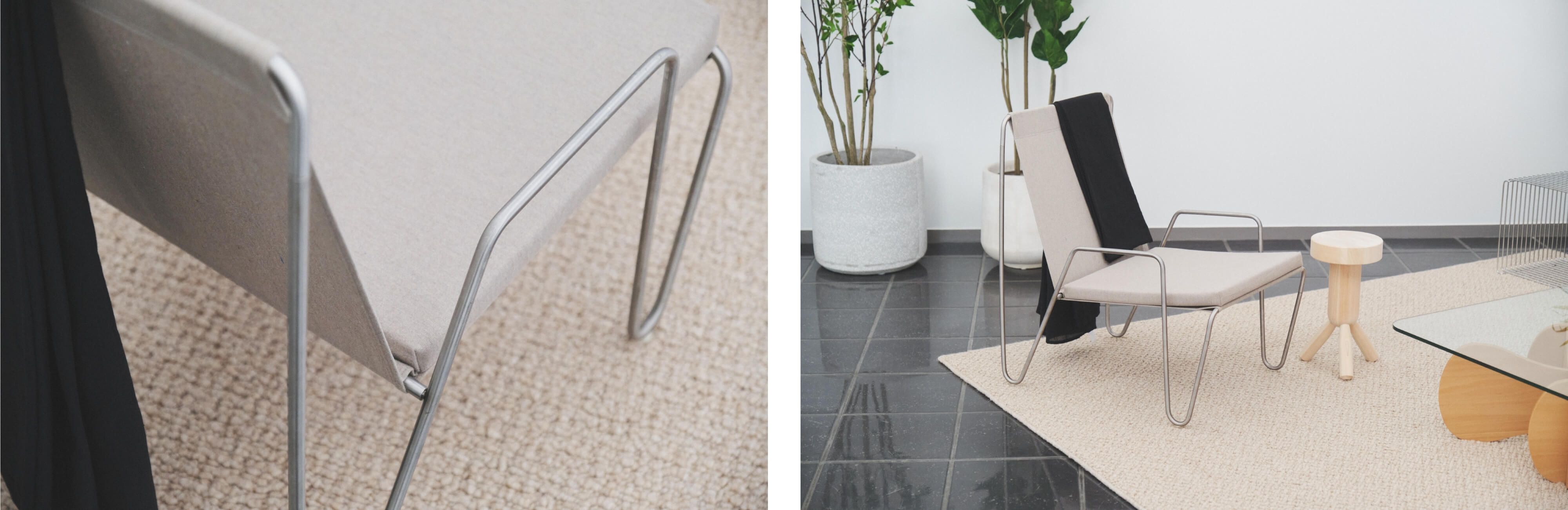 固いイメージのある金属パイプのバチェラーチェアと、ヒノキが主材のトコノマスツール。