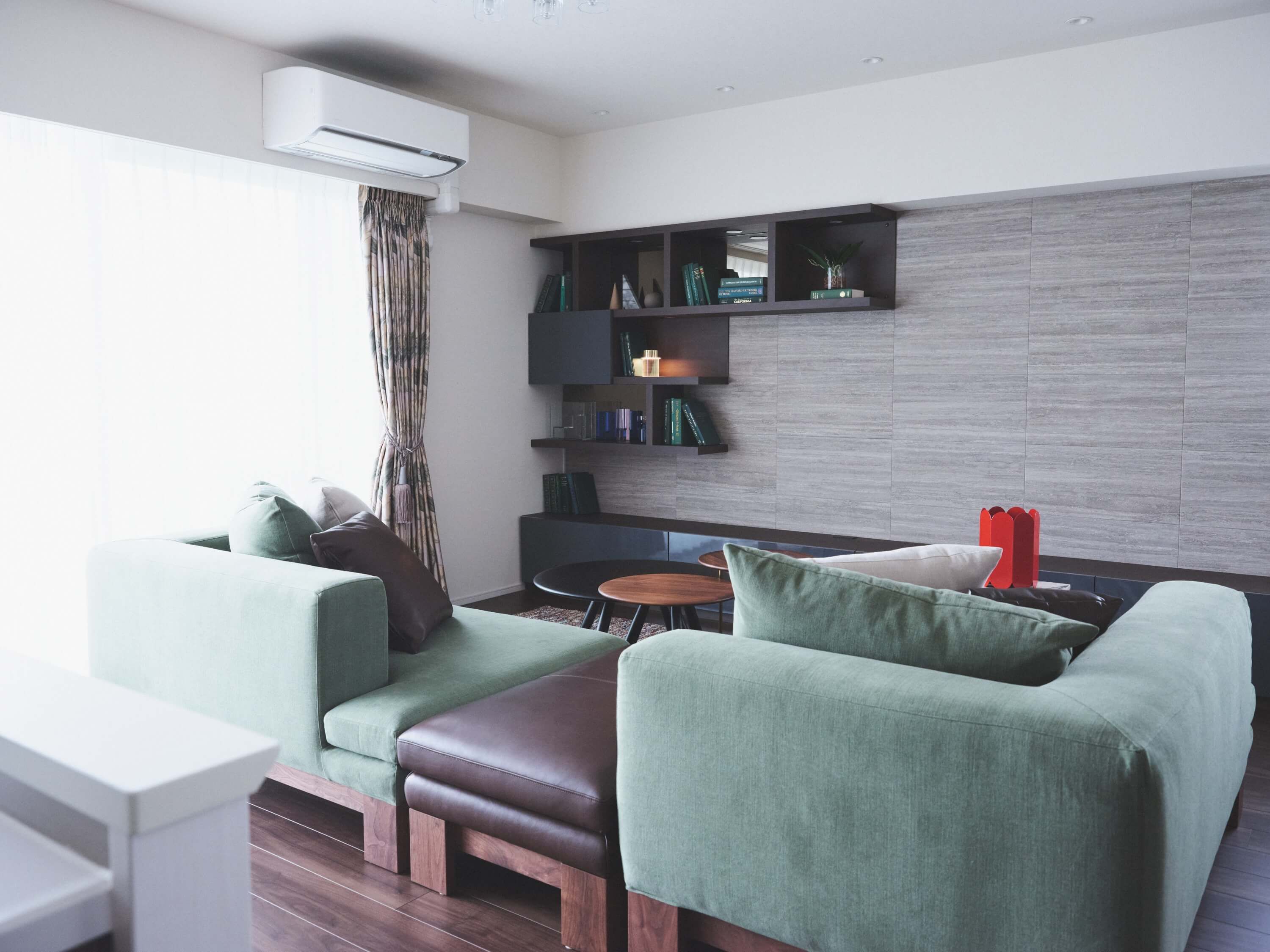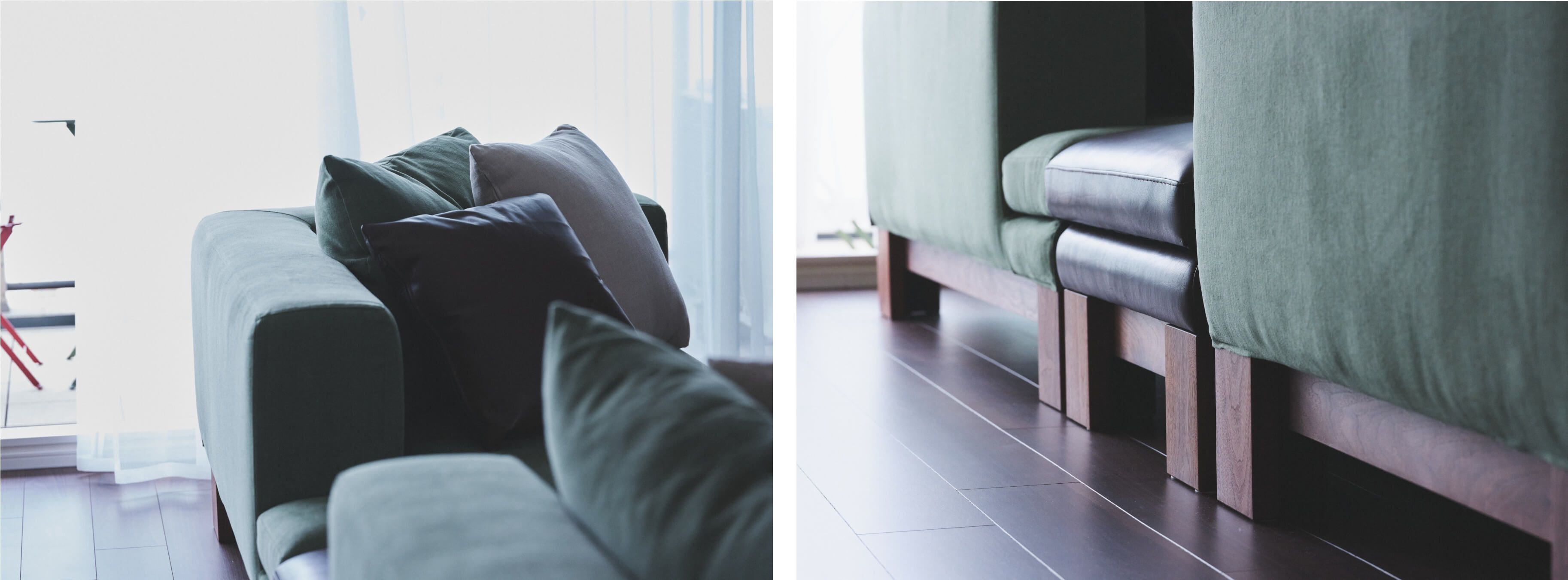 ソファはリグナオリジナルブランドのコモリソファ。張地には深いグリーンを採用、ウォールナットの床と良く合います。
