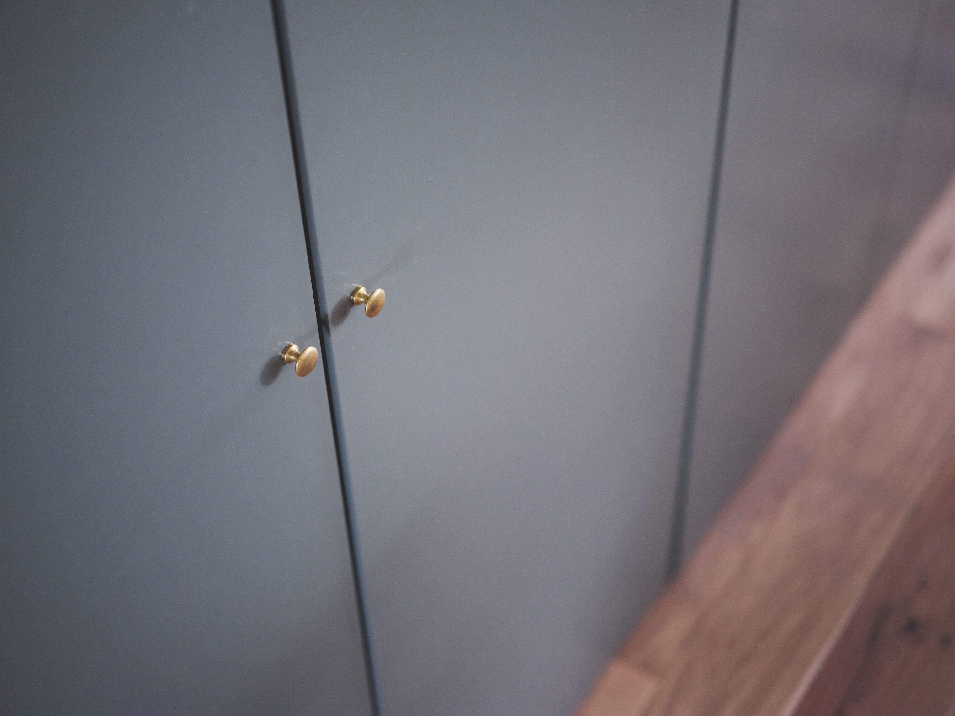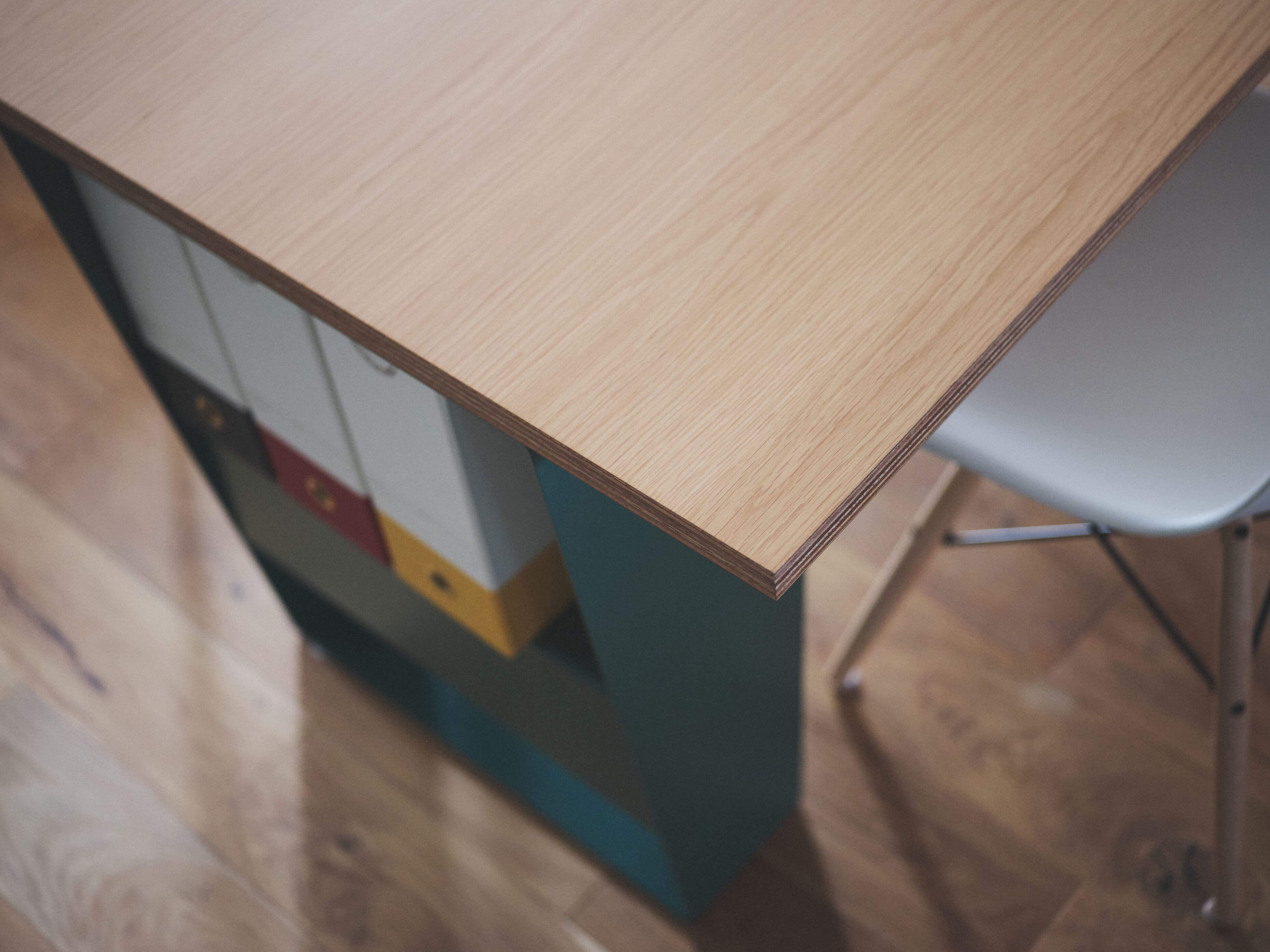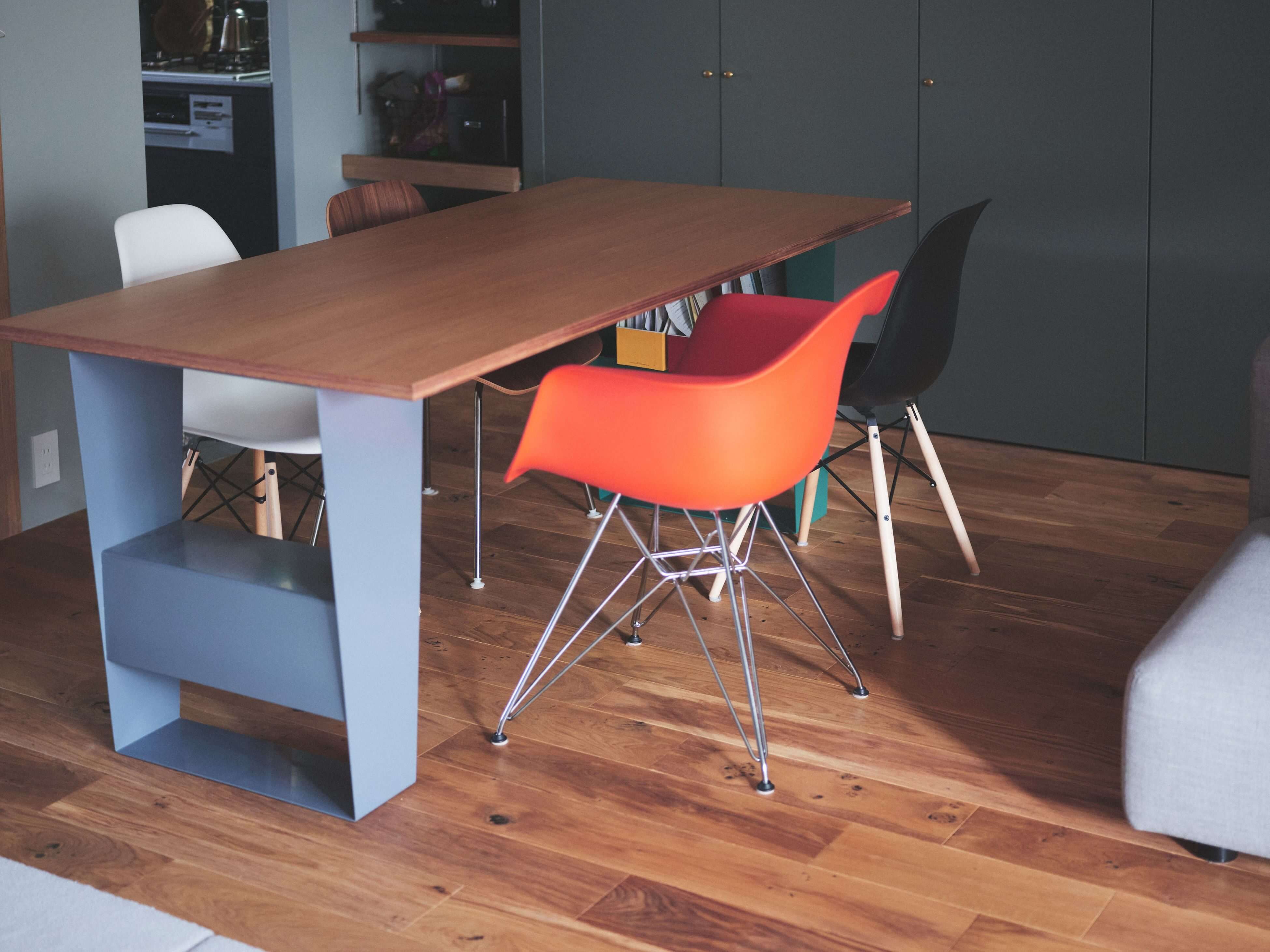 子どもたちの大量に発生する学校のプリントや、掃除をするためのウェットティッシュなどがしっかりと収納できるように、実用性に配慮したシェルフ付きのデザインを提案して頂くとともに、スチールレッグの部分に「シールをぺたぺた貼ってもかわいいですよ」と、新品のきれいな状態のイメージだけでなく、小さな子どもたちがいる家庭において時を経た家具のイメージを共有してくださることで、さらに家具に対する愛着を抱けるようになりました。