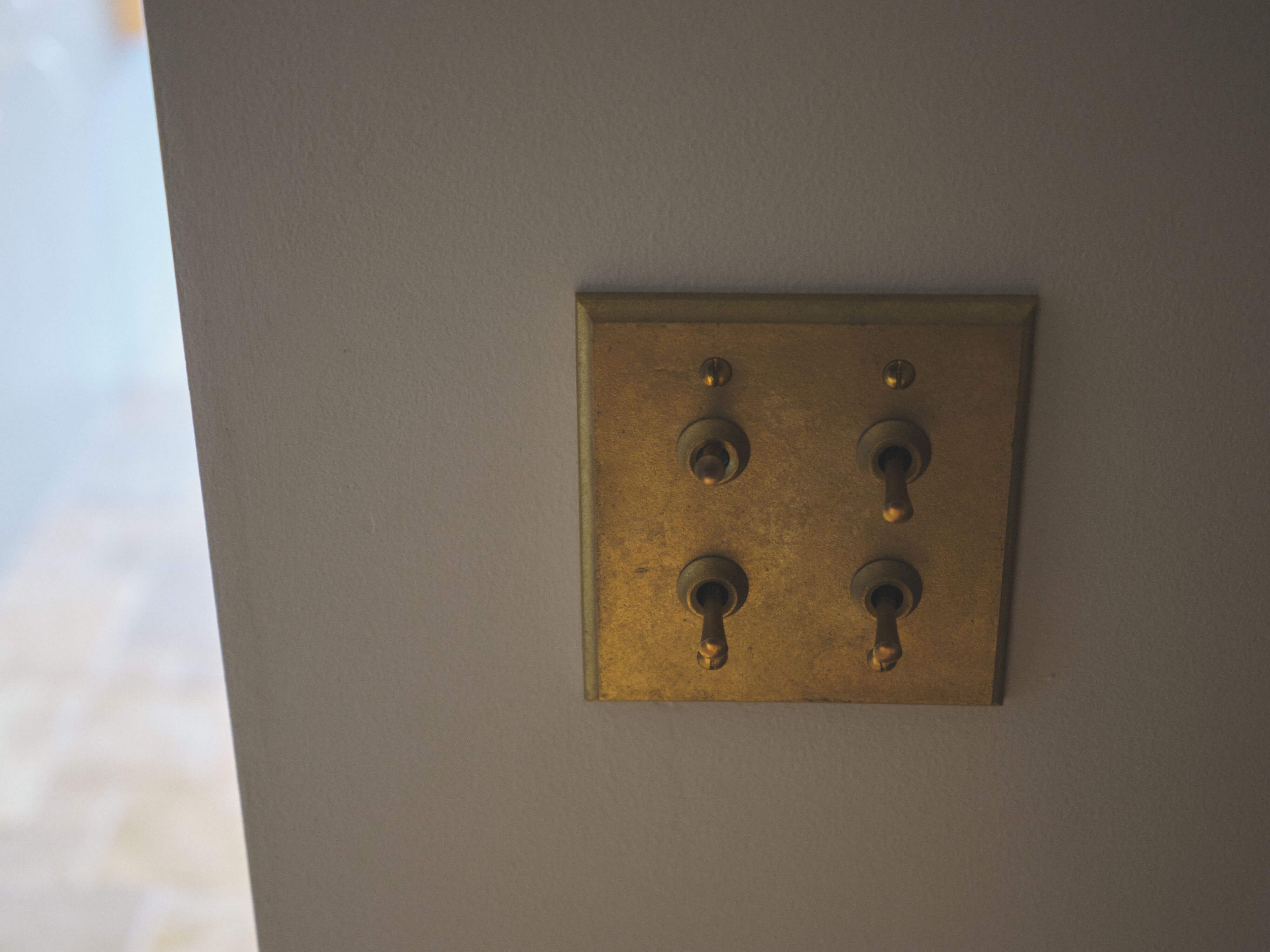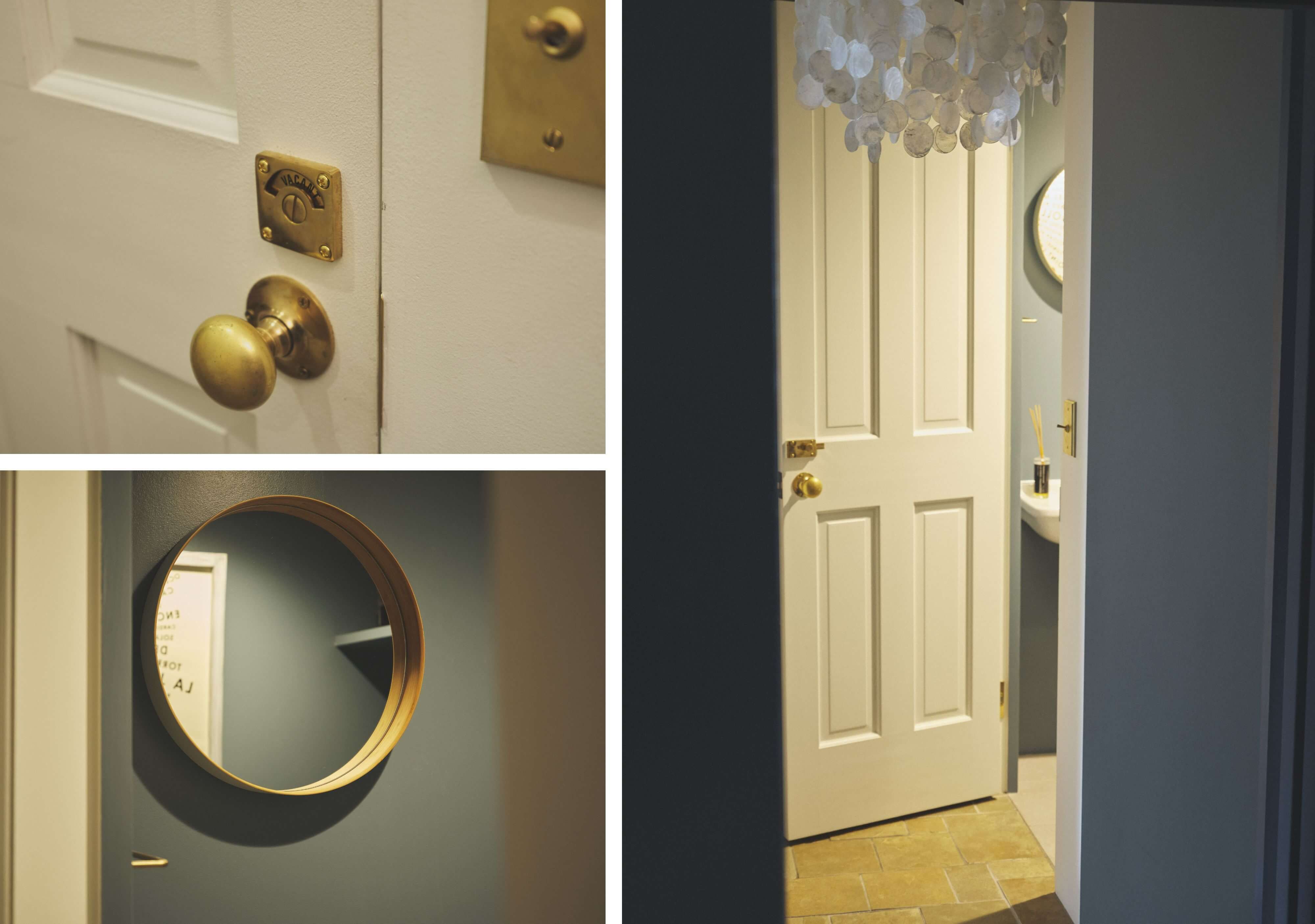 ドアノブやスイッチは真鍮しばり!深い海の底でキラキラ光るサンゴを連想しちゃうお手洗いスペースです。