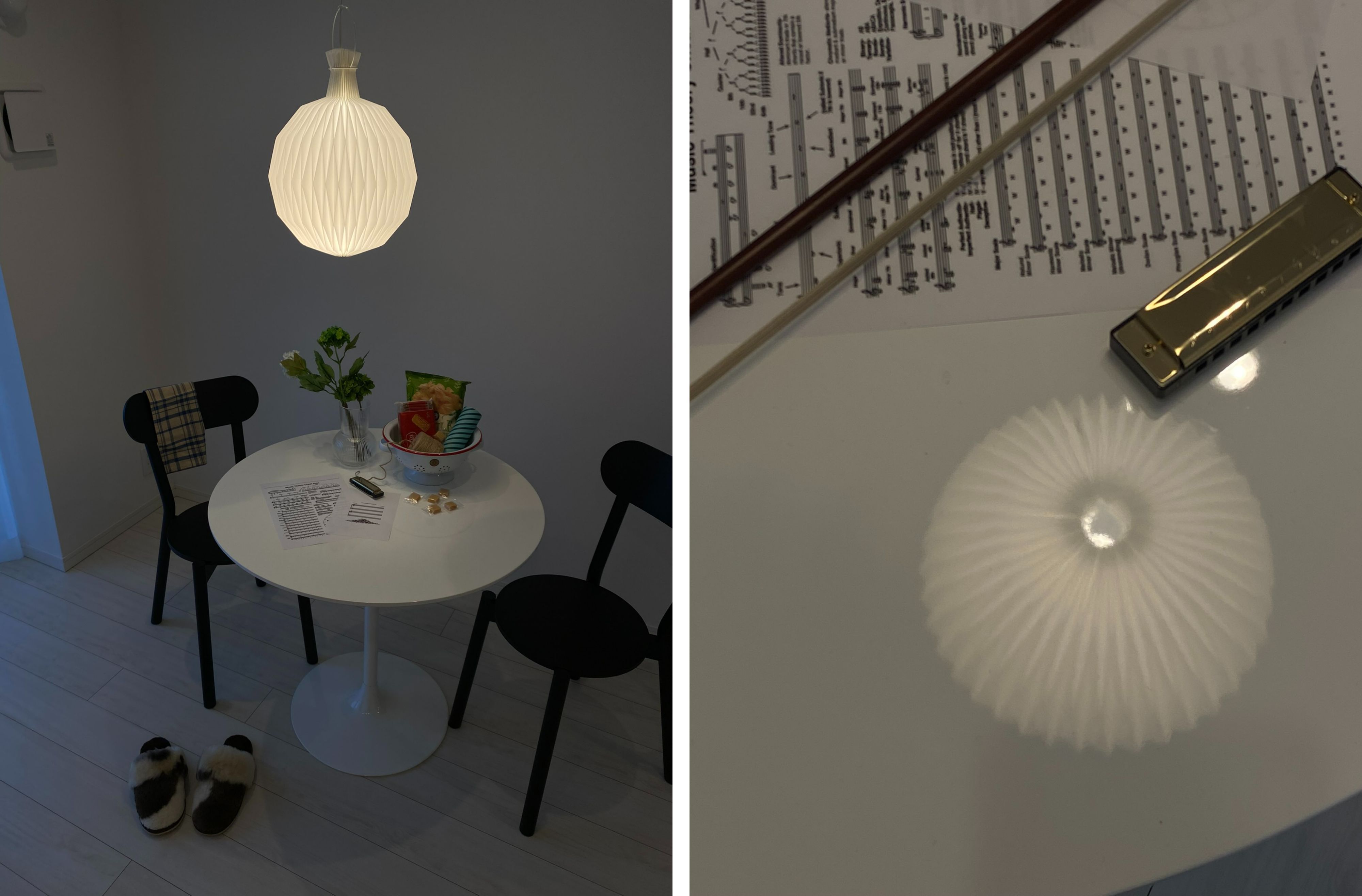 ダイニングを彩るのは、日本の折り紙をヒントにした「レクリント」のペンダントライト。