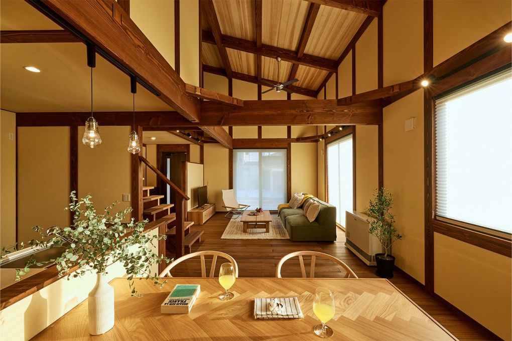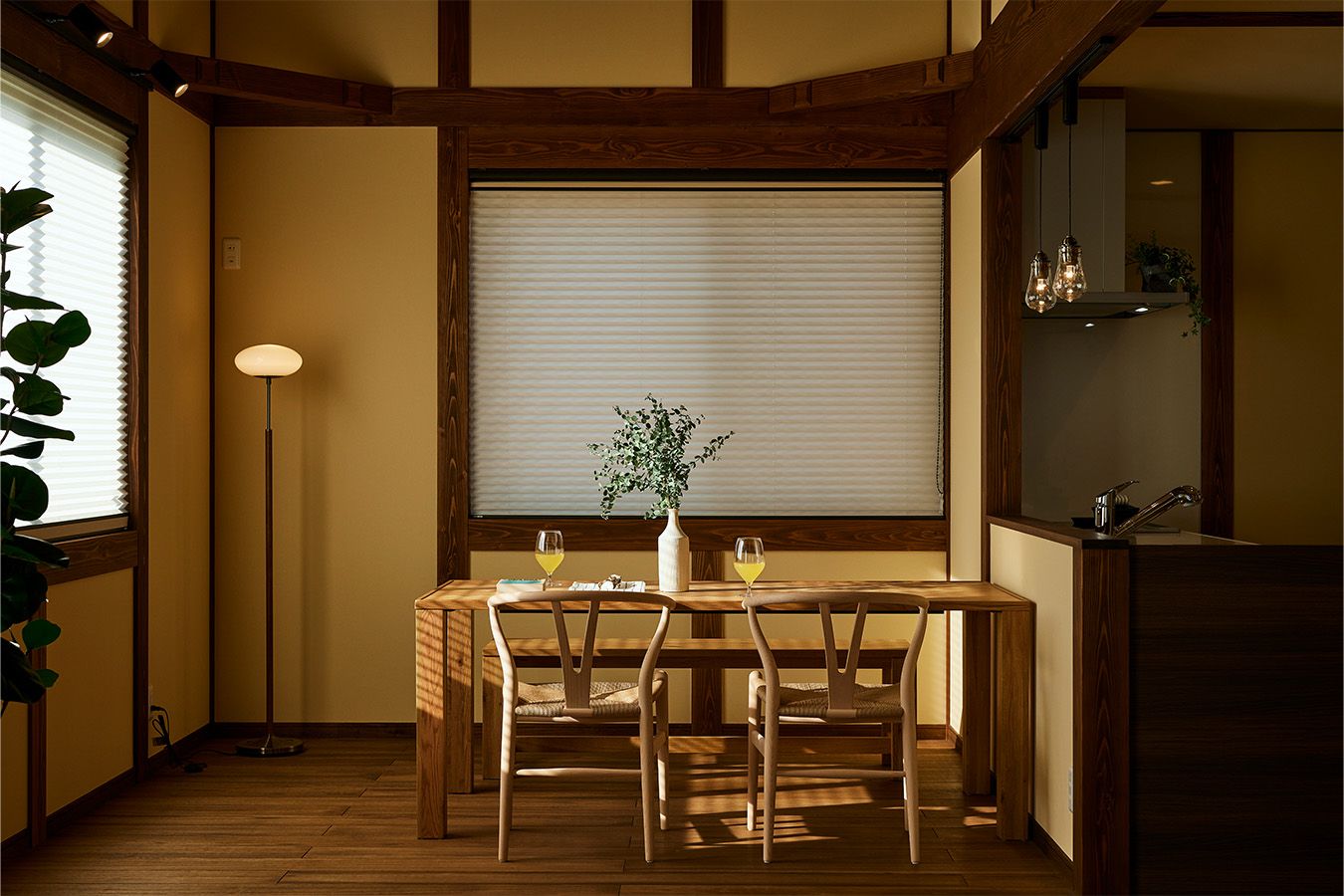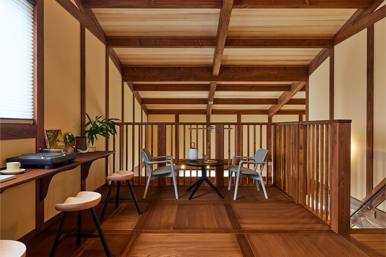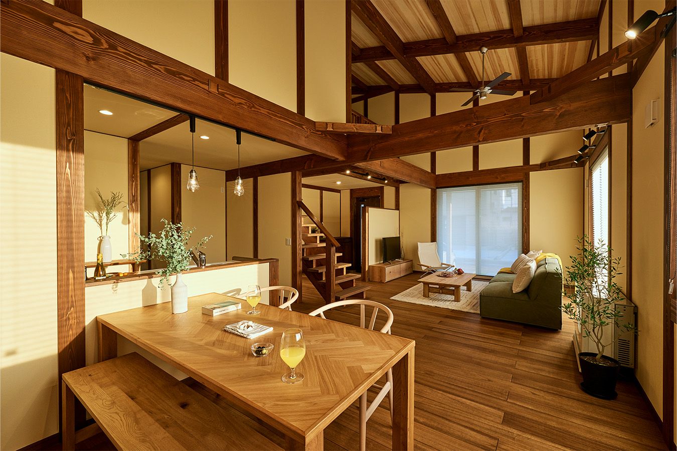 柱や梁をあらわしにした、日本の伝統的な構法である真壁造りのしつらえ。