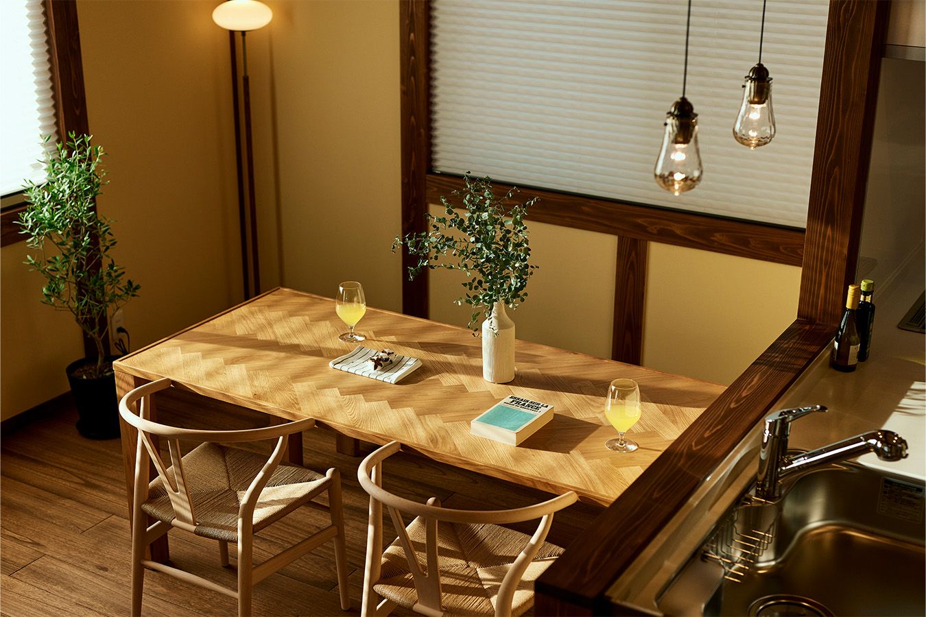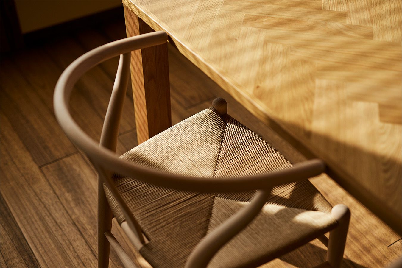内装材の豊かな素材感に負けないよう、テーブルは風合いたっぷりな無垢材のものを選定。