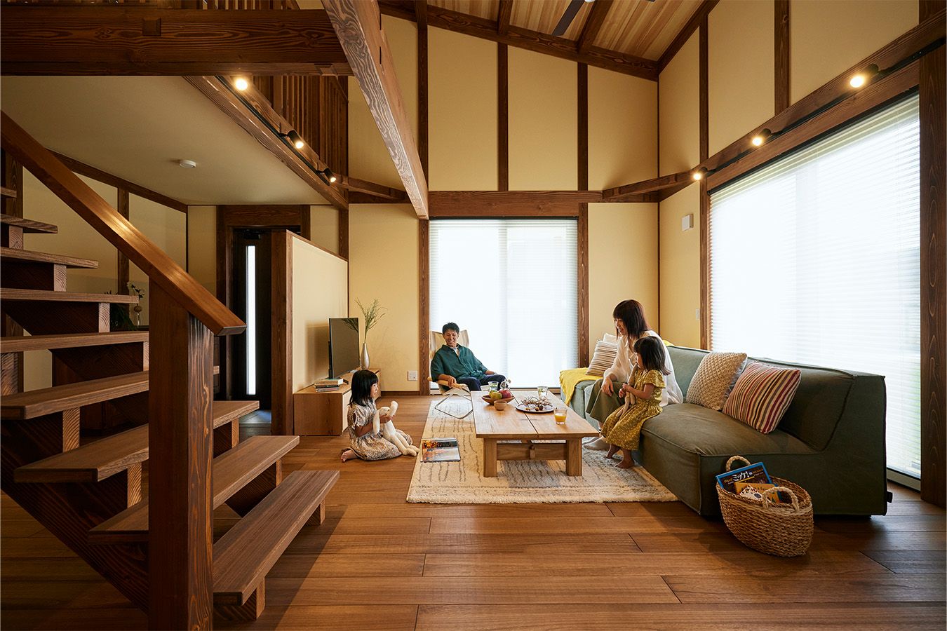 ダイニングとひと続きの、明るく開放感あふれるリビング。その中心には、家族みんなが自由気ままにくつろげる、ゆったりとしたローソファ。