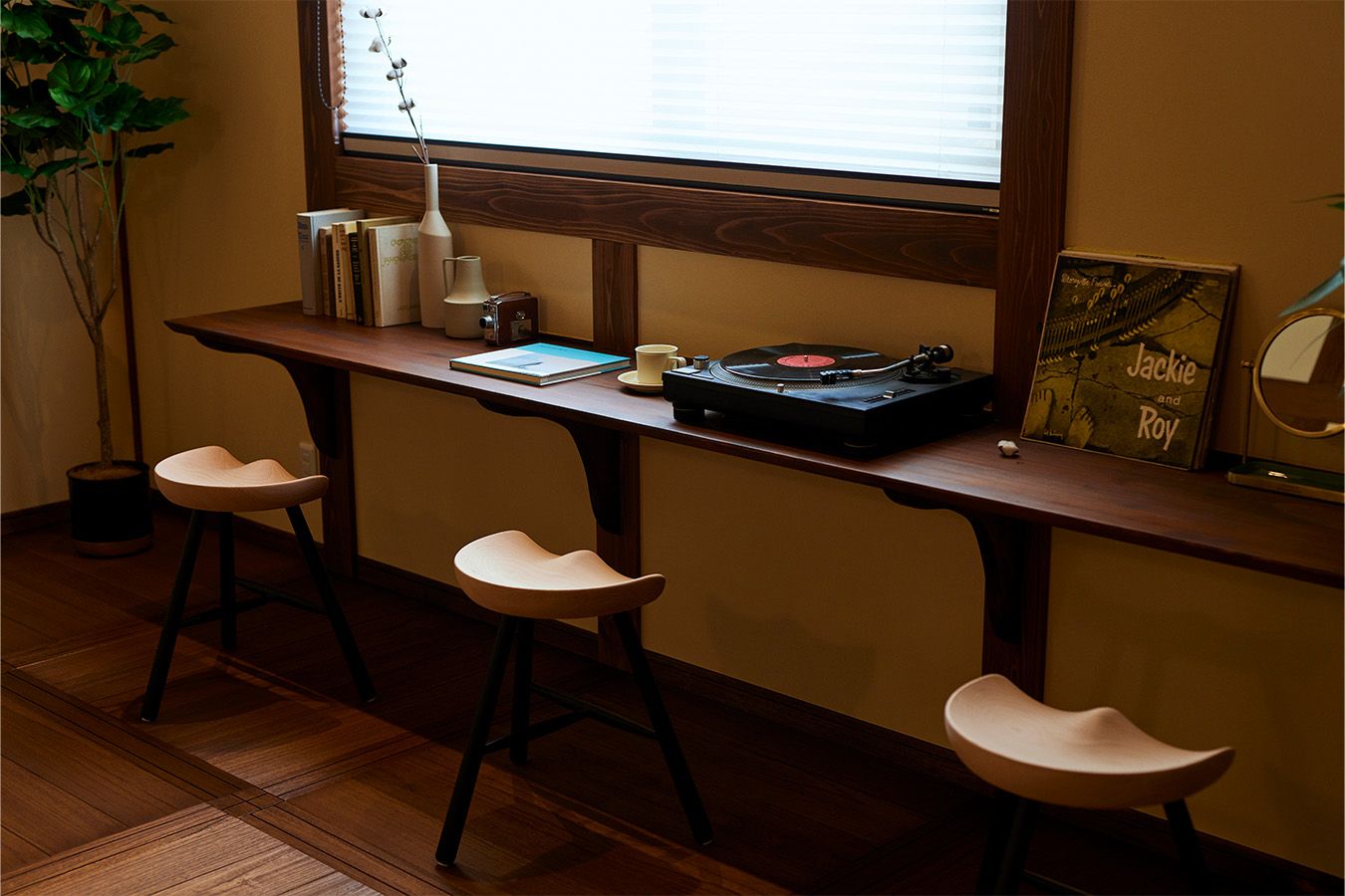 その横の造り付けのテーブルに並ぶのは、Yチェアと同じくデンマーク生まれの伝統的なスツール《シューメーカーチェア》。
