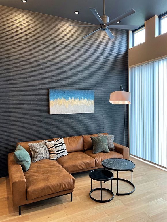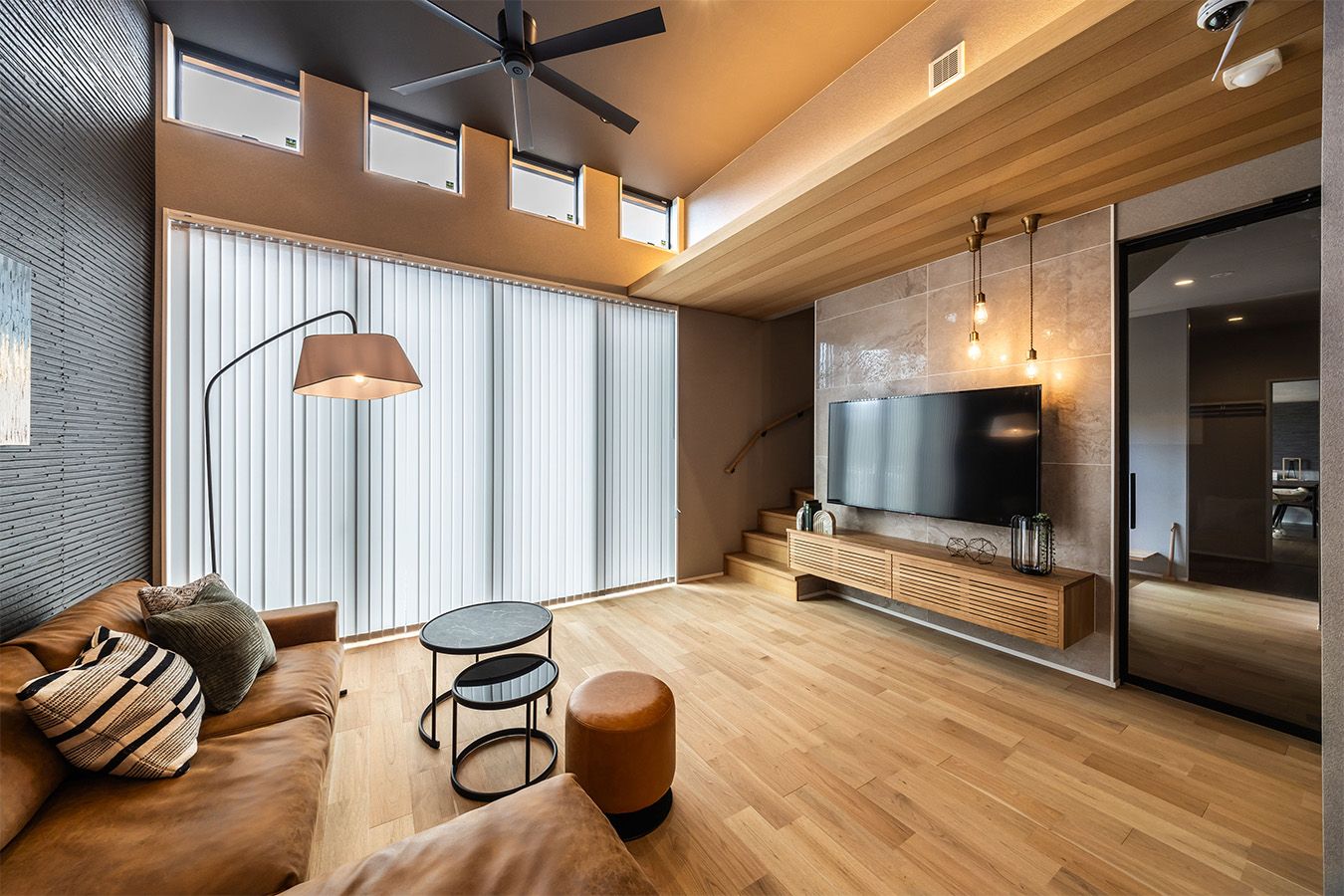 ブラックの外装タイルがあしらわれた壁面、贅沢に天井高をもたせた今回の空間と相性のいいスタイルです。