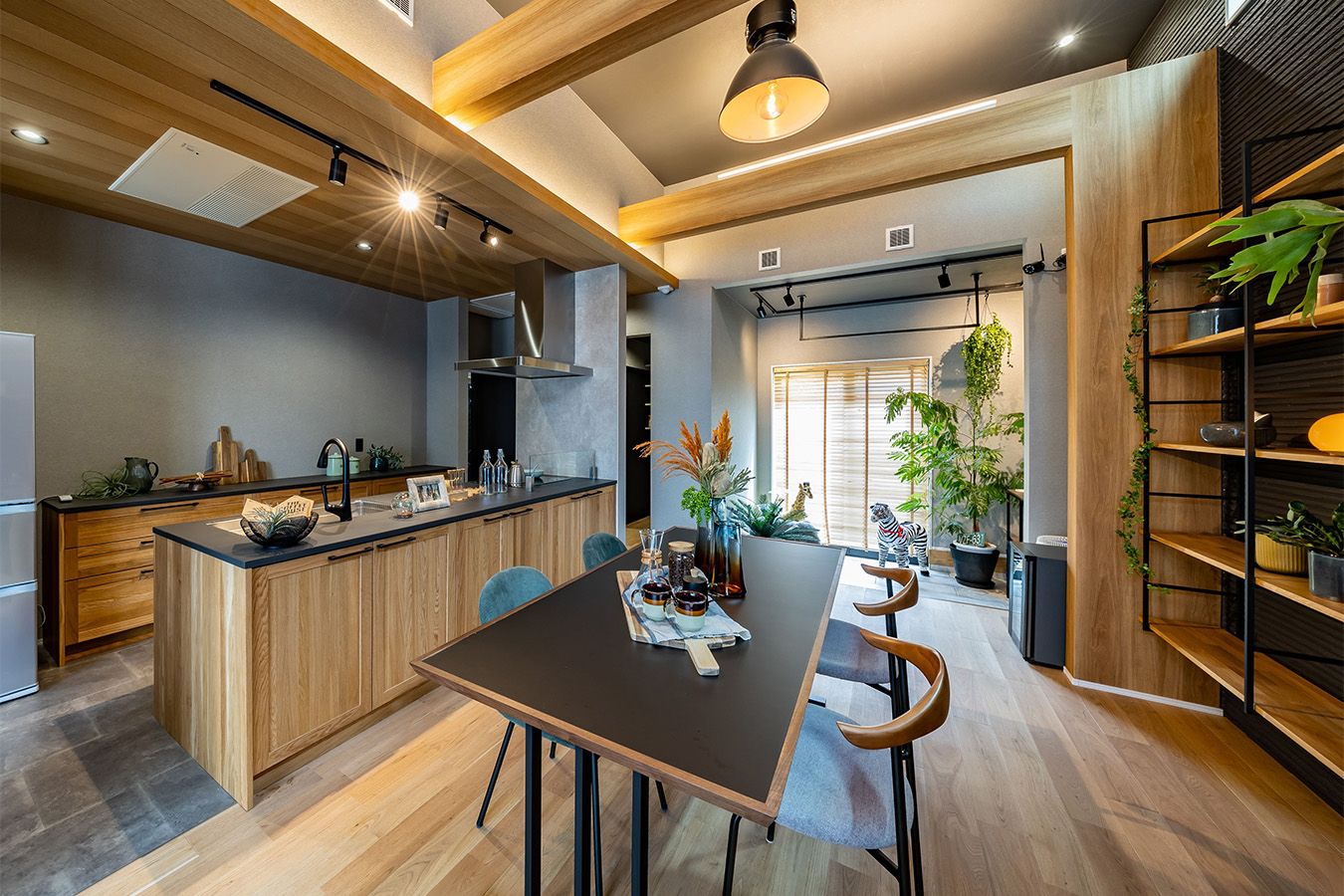 インダストリアル(工業的)な家具を合わせたスタイル。無垢材をふんだんに使った内装や、
