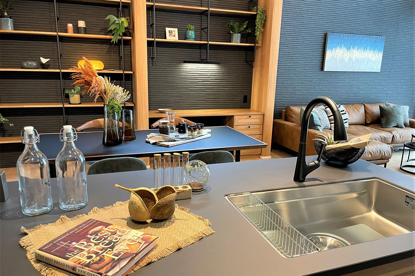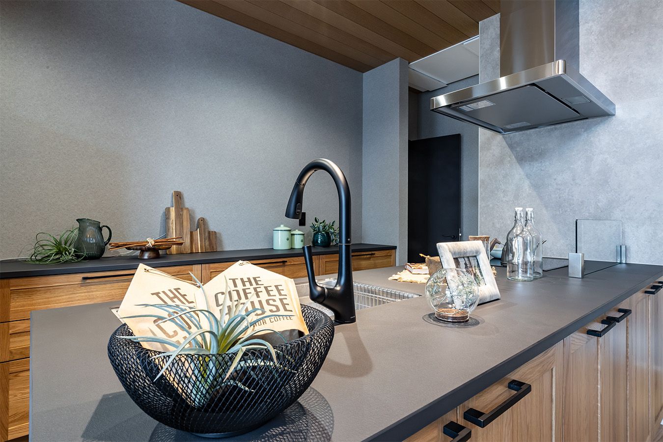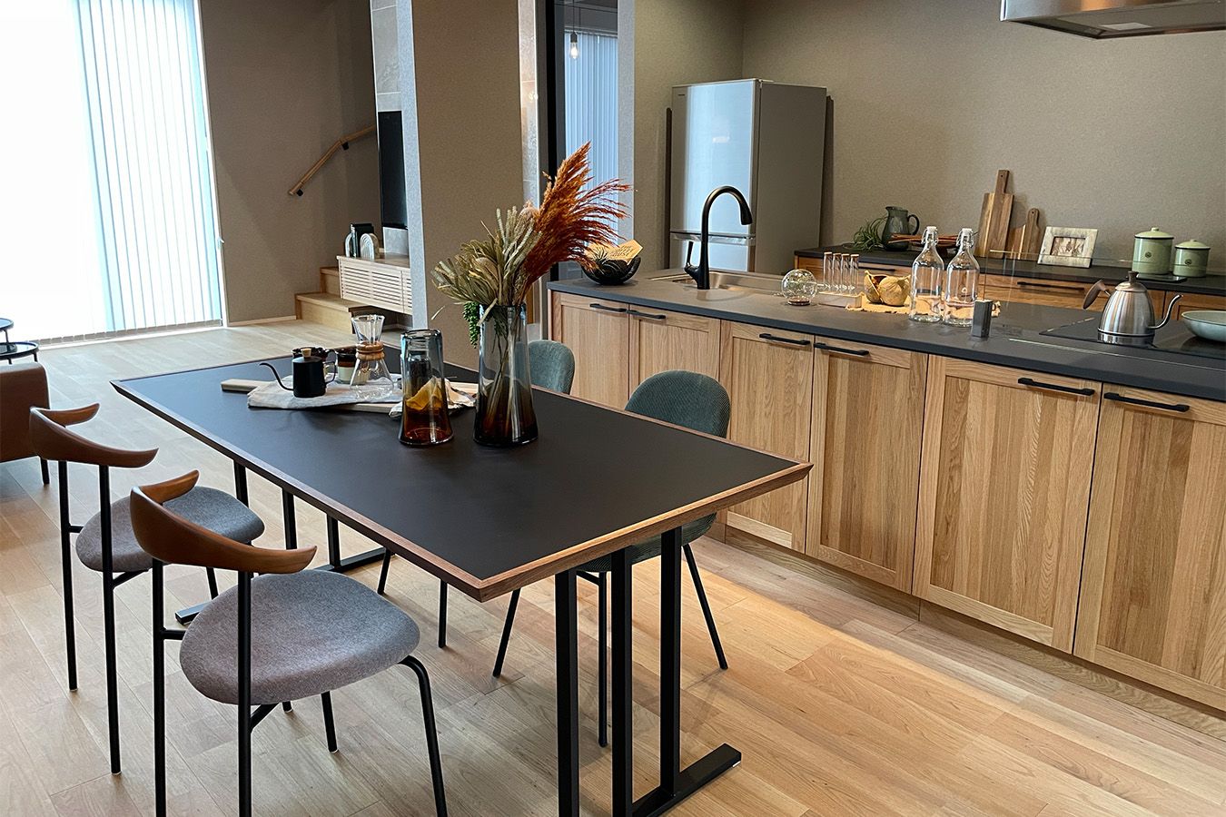 キッチンカウンターとリンクしたマットなブラックは指紋レスメラミン化粧板、四方の木部分はウォルナットの天板。