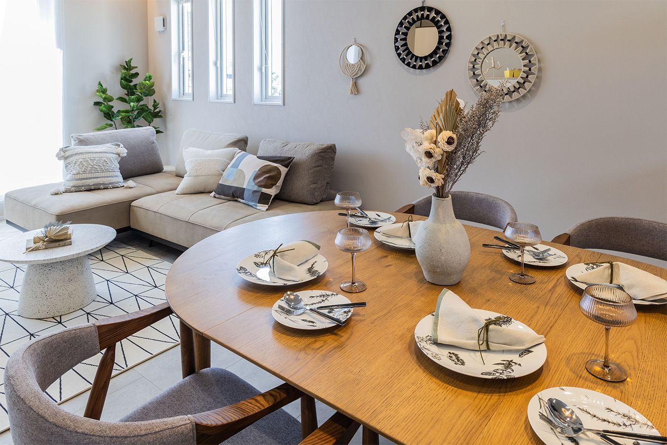 リグナのオリジナル伸長式ダイニングテーブル『LIVELY』。今回は伸長後の幅170cmでご家族の食事シーンを演出。広さにゆとりがあるのでレストランのようなテーブルコーディネートも