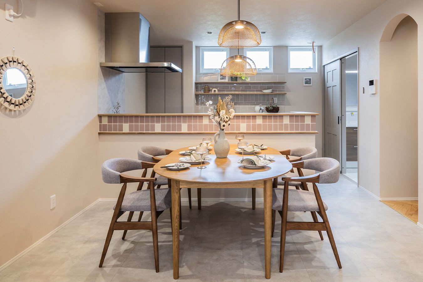 オープンなアイランドキッチンとシームレスに繋がるダイニングは、カウンターに立つ人とダイニングで過ごす人、お互いの顔が見えて会話が弾みそう。友人達を招いてホームパーティーを開きたくなります。