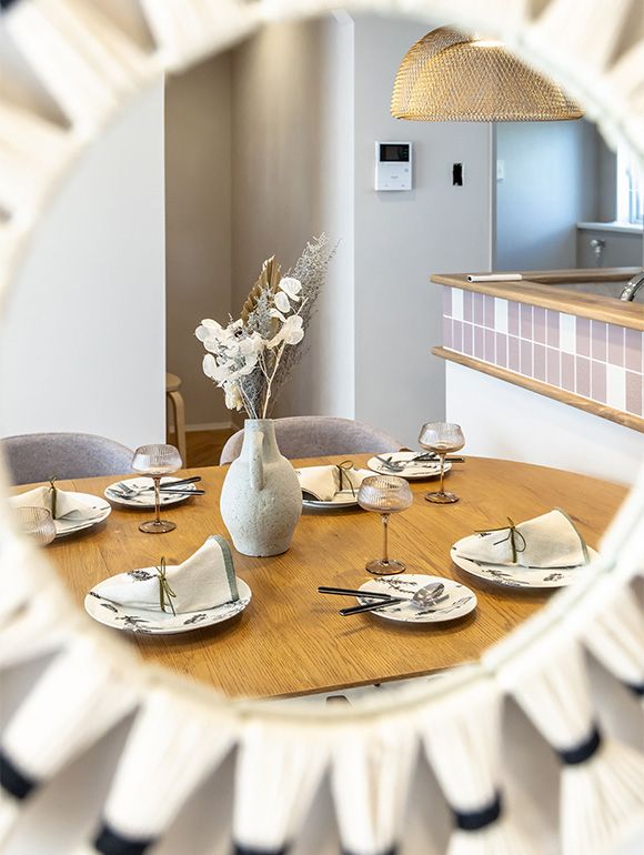 ダイニングからリビングへつながる壁面にはマクラメで装飾されたミラーをオブジェやアートのように飾りました。