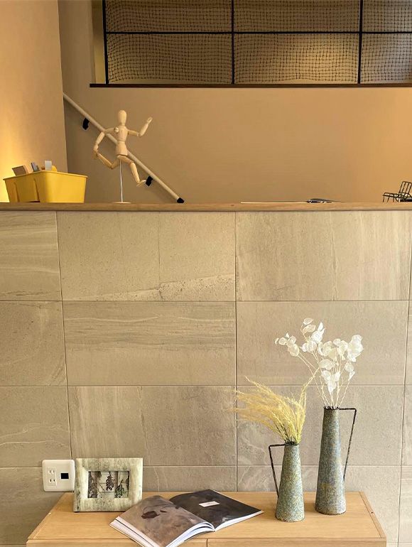 外装材のタイルを使った広い壁面には存在感のある幅120cmのアートを、ソファのサイドにはダイナミックなサイズ感のフロアライトを置くと空間に映えます。