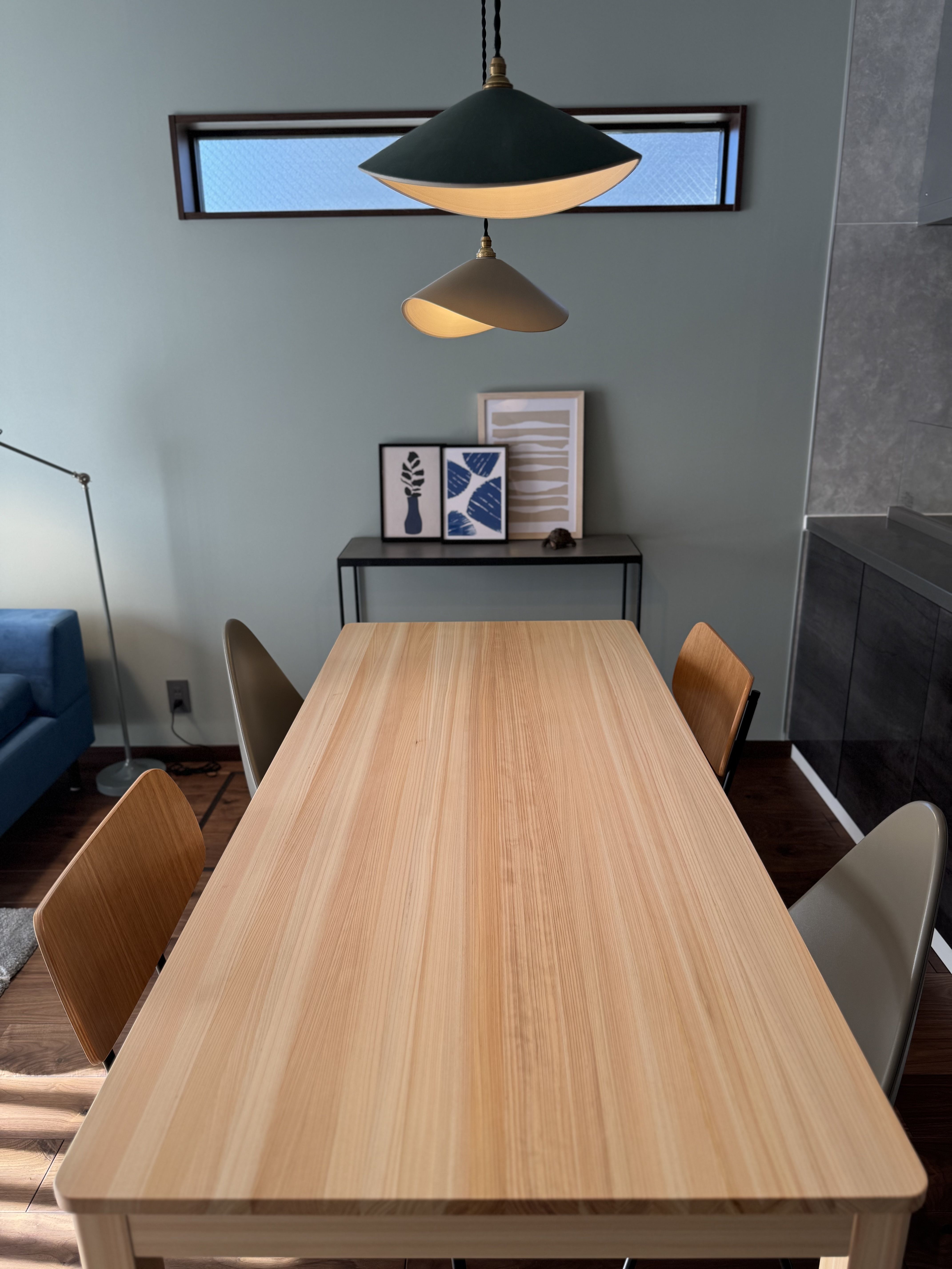 パターンの点では、クッションやラグといったファブリックに幾何学模様を用い、アートも幾何学模様に近い抽象画をメインにセレクト。ソファのブルーとリンクする色使いで、リビングとダイニングに一体感をもたらしています。
