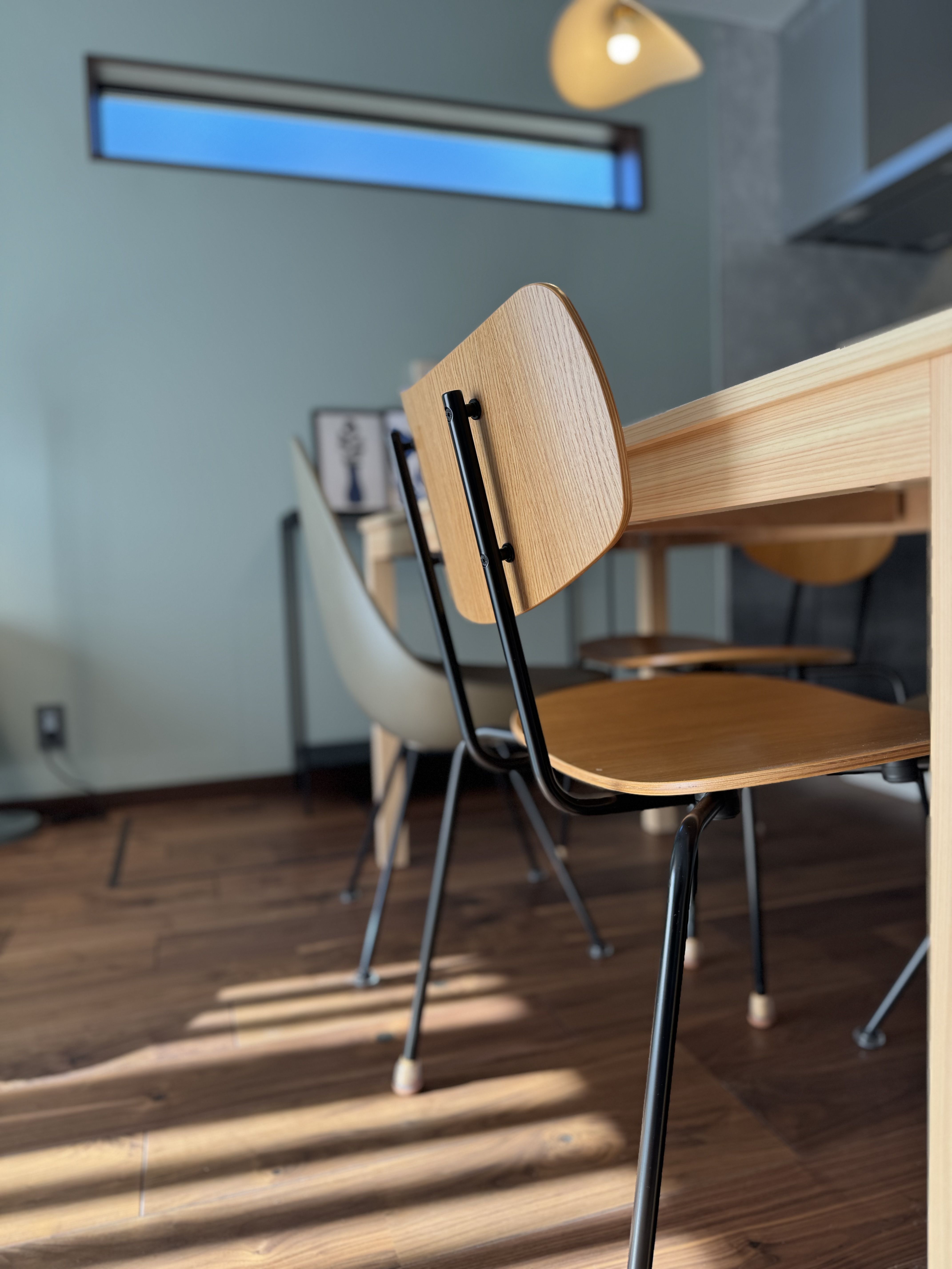 異なるブランドや一見バラバラに見えるデザインでも、素材やフォルムなどに共通点をみつけて組み合わせると、自然と空間にまとまりが生まれます。今回は2種類のチェアとコンソールテーブル、ソファの脚部をアイアン・スチールのブラックでそろえています。さらに照明やアートのフレームのブラックはスリット窓のサッシともリンク。ブラックの直線的なラインは軽やかに引き締める効果も。