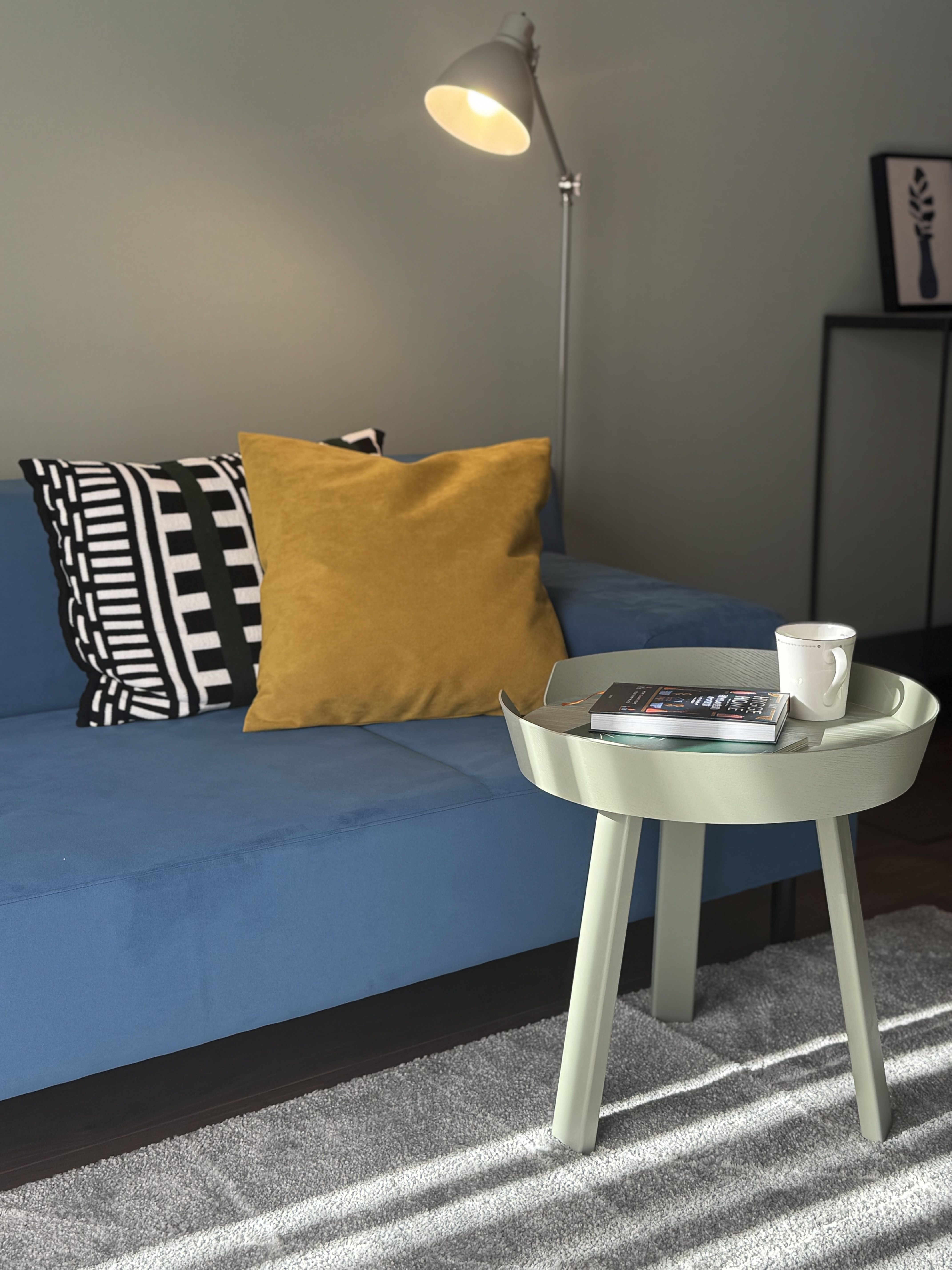 グレーがかったやわらかなブルーは落ち着きがあり、冬でも冷たい印象にならず、やさしい存在感があります。クッションのイエローもブルーの補色(反対色)をマスタードカラーにすることで落ち着いた彩りに。ソファ周りに置くサイドテーブルやフロアスタンドも、グレー味がかったダスティなカラーで統一しています。