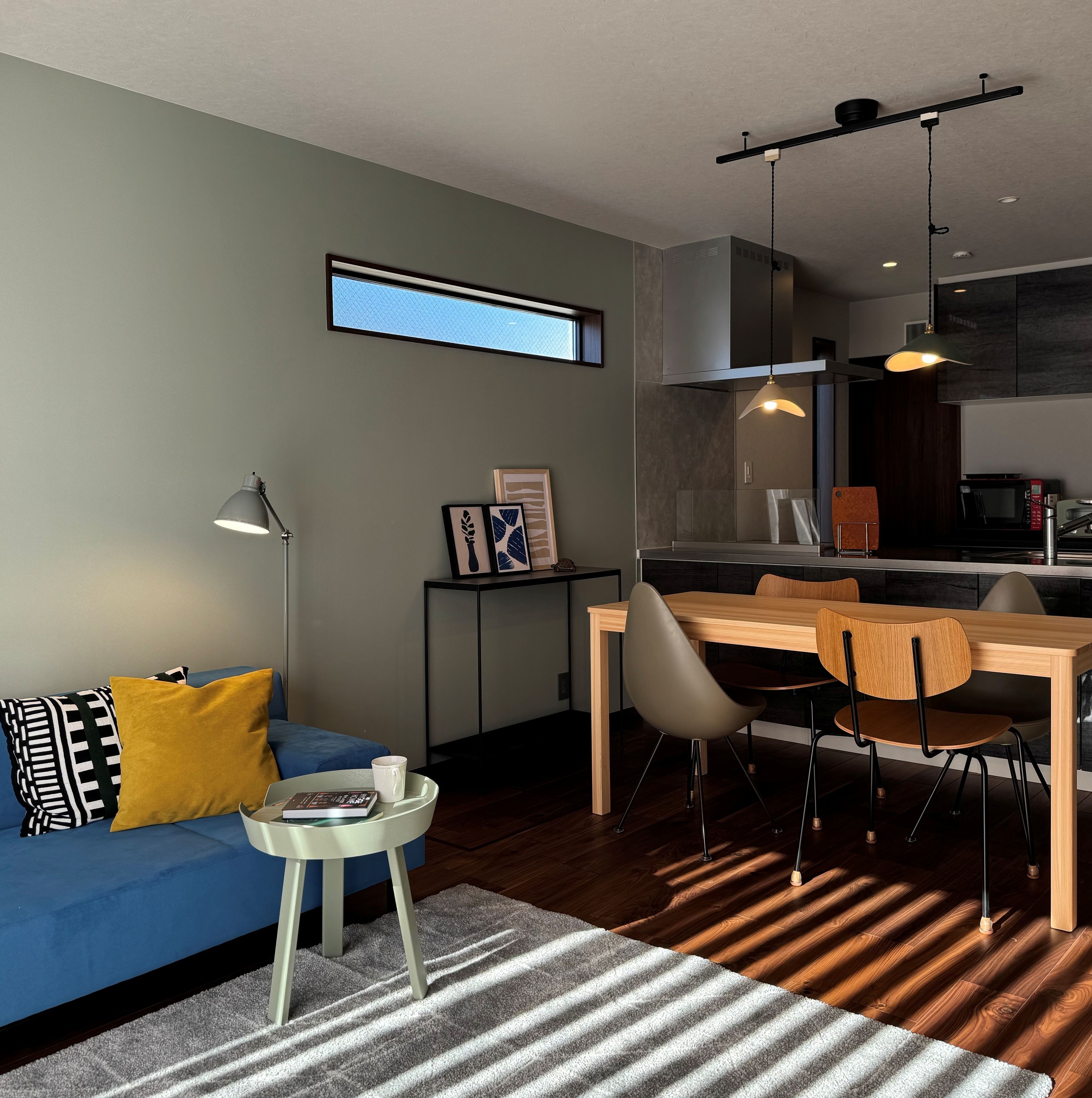 カラーリングは複数色を使用しながらも、全体的にダスティな色味で統一感を持たせています。ベースとなるのは、アクセントクロスに使われているグレーカラー。面積の大きいソファのブルーは寒色のため、近しいトーンのグリーン系アイテムを合わせています。ダスティグリーンのサイドテーブル、緑がかったグレーのフロアスタンド、オリーブカラーのドロップチェア、モスグリーンのペンダントライトなど。そして、反対色となるイエローを小面積のクッションで差し色として取り入れ、全体にリズムを加えています。