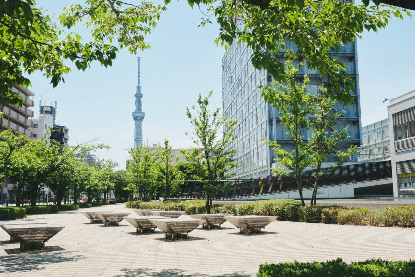 オフィス、住宅、レストラン、クリニックなど様々な用途の建物を有した複合型施設、リバーサイド隅田。