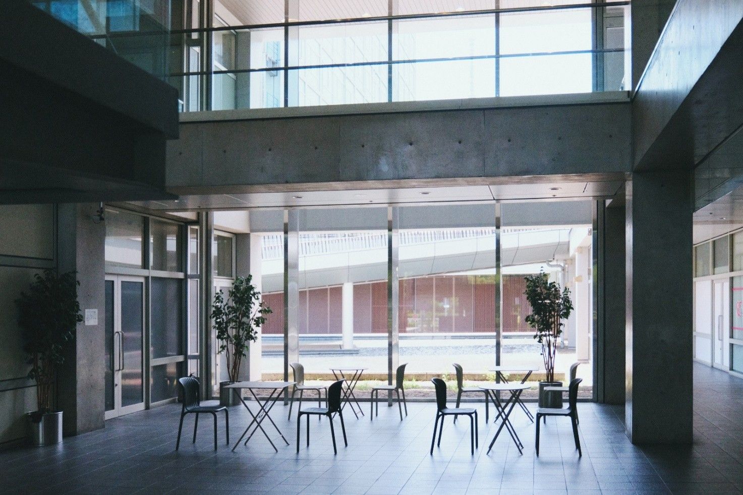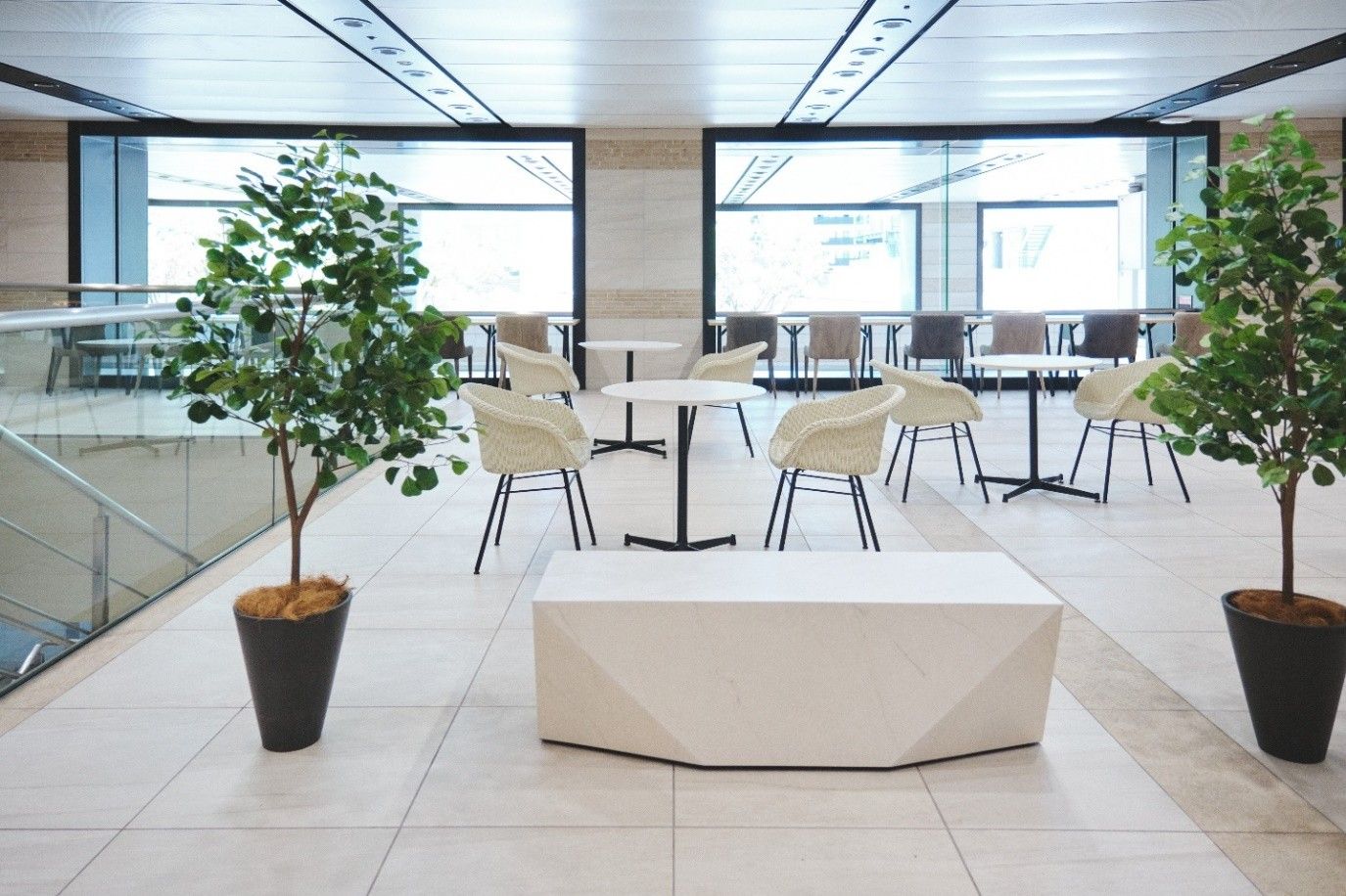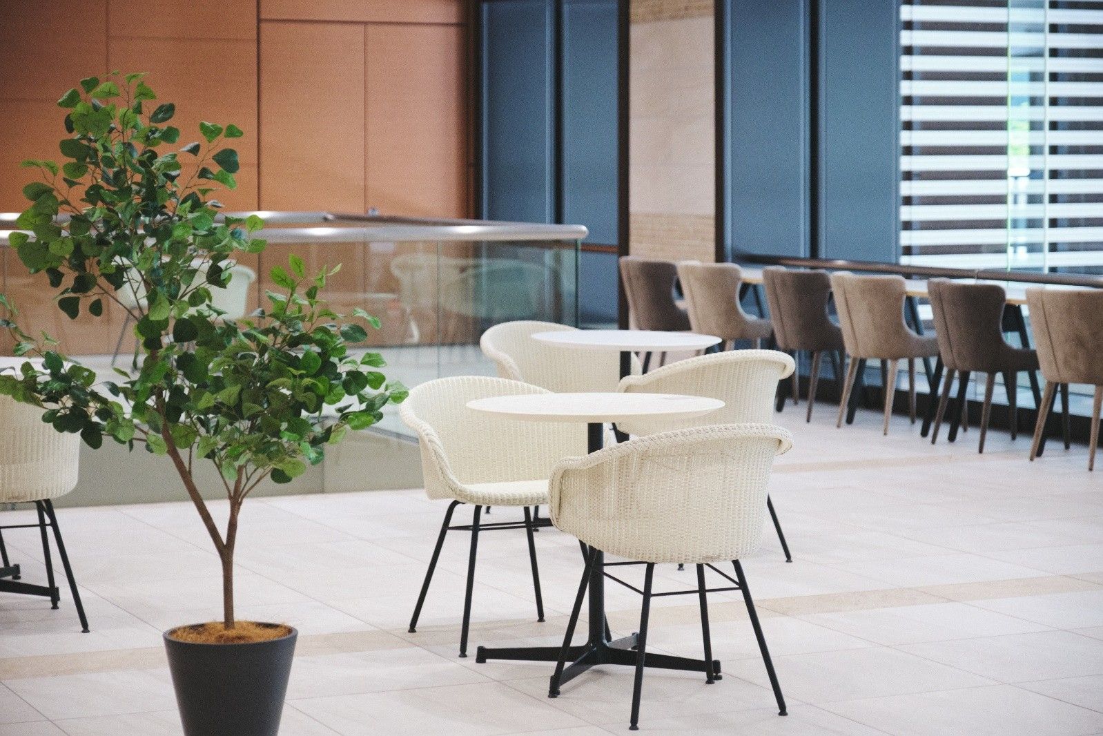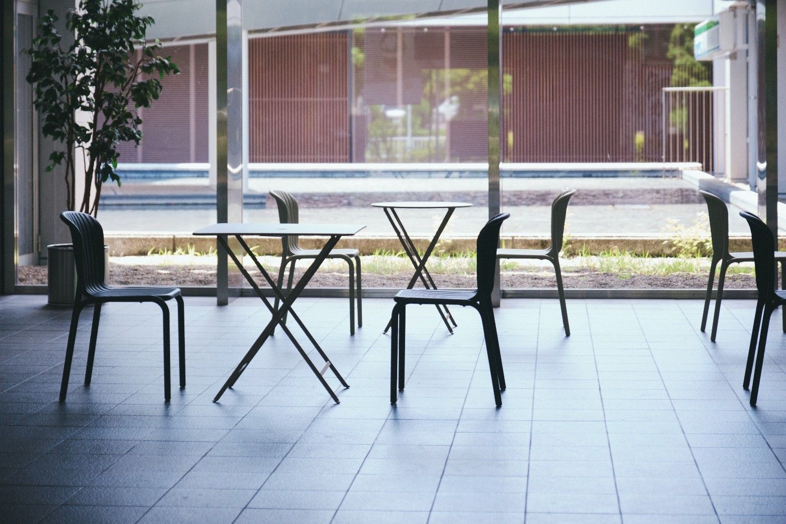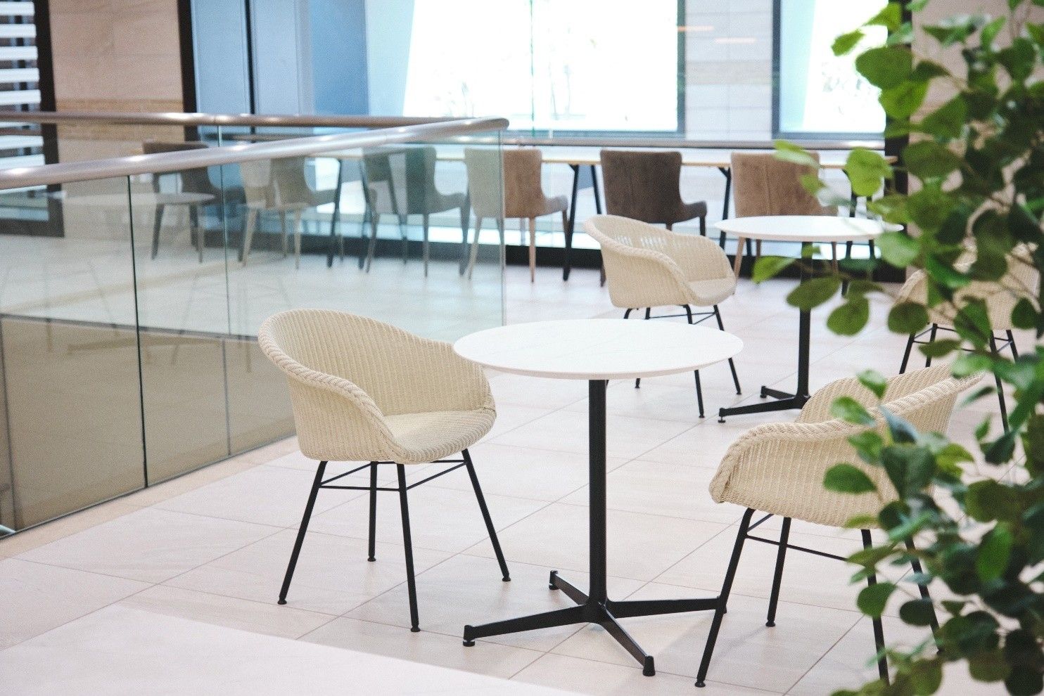 採光の良い吹き抜け空間に配したガーデンテーブルとチェアのセットは、まるで海外のミュージアムカフェのような佇まい。等間隔に並んでいた植栽の配置を見直し、点在させることで、壁いっぱいに設けられた開口部からパティオを望めるようにしました。