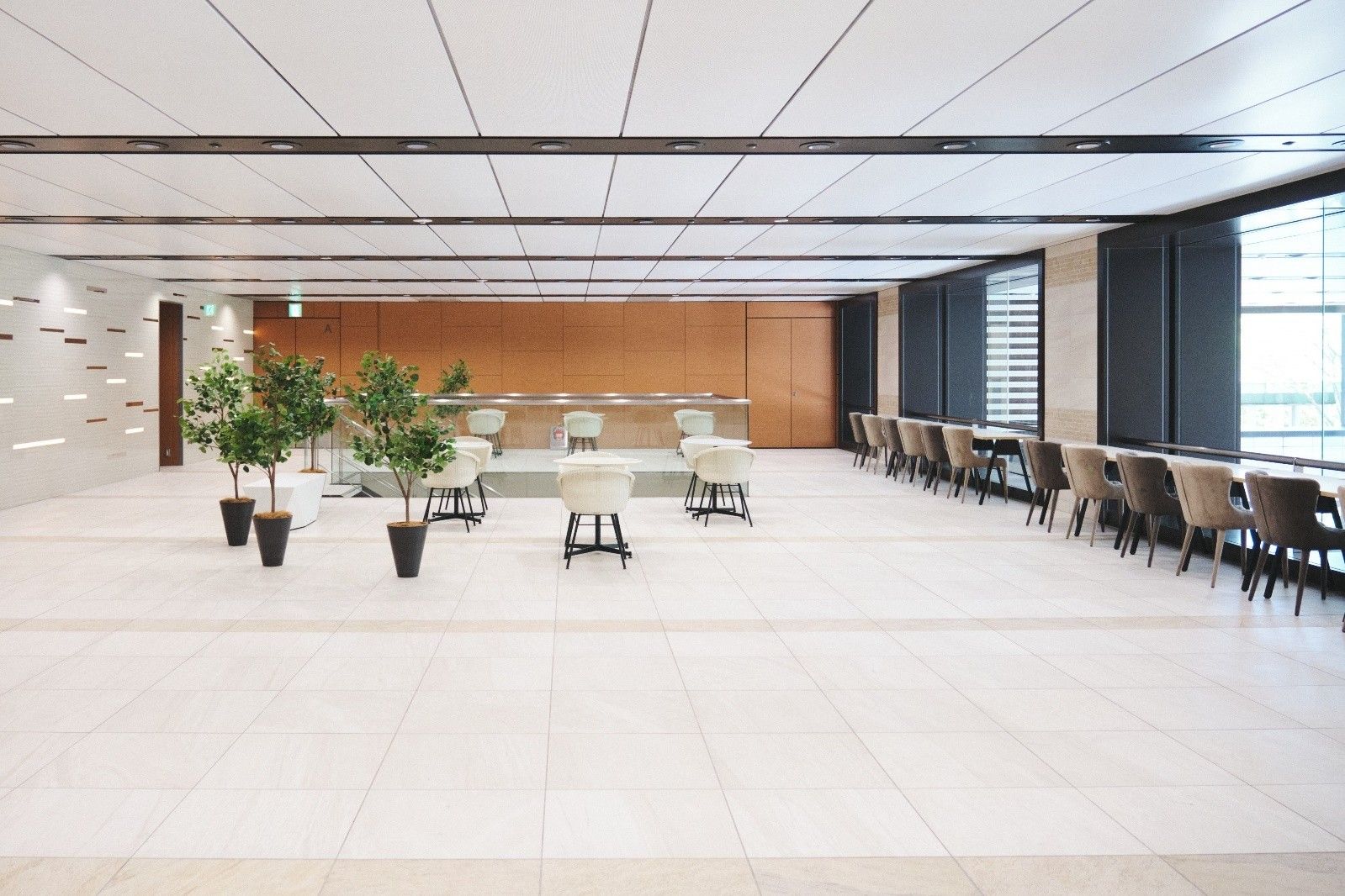 カウンターやサークル型のカフェテーブル、ベンチなど、用途に合わせたバリエーションを持たせることで、待ち合わせや休憩、ちょっとした打ち合わせまで、多目的に使えるエリアを目指しました。
