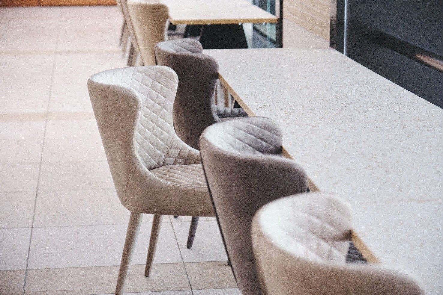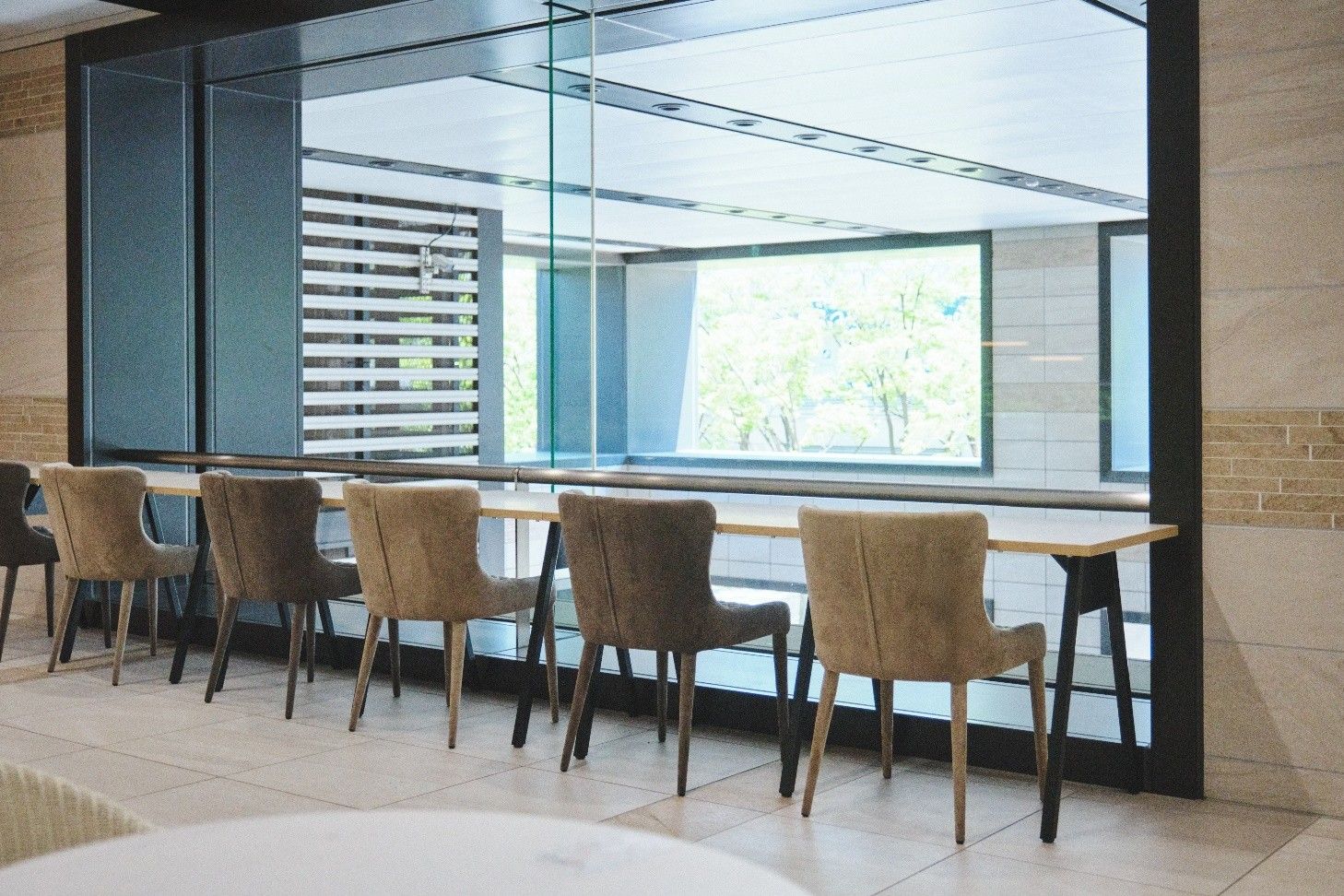 カウンターには、体を包み込むようなキルティング張地のチェアを合わせ、外の景色を眺めながらほっこりとくつろげるスペースに。
