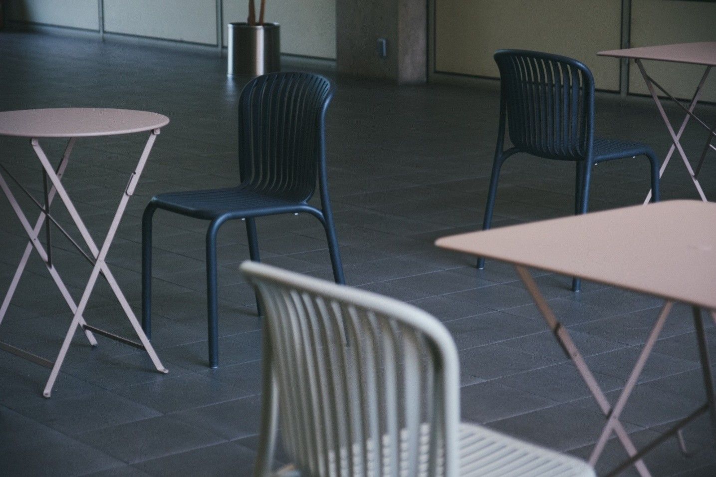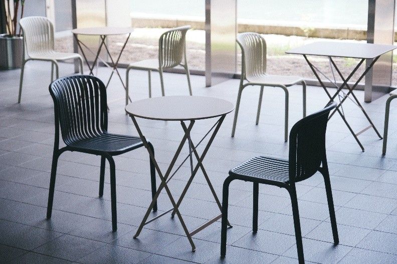 カウンターテーブルやカフェテーブル、ベンチはASPLUNDが扱う新素材『STELAPOP』で統一しています。
