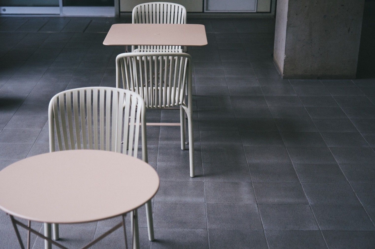 テーブル形状はサークルとスクエアで変化をつけ、単調さを抑えています。