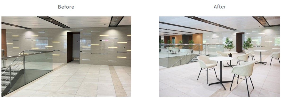 今回はオフィス棟の共用部と、レストランやショップが並ぶ商業棟の未利用スペースを対象に、