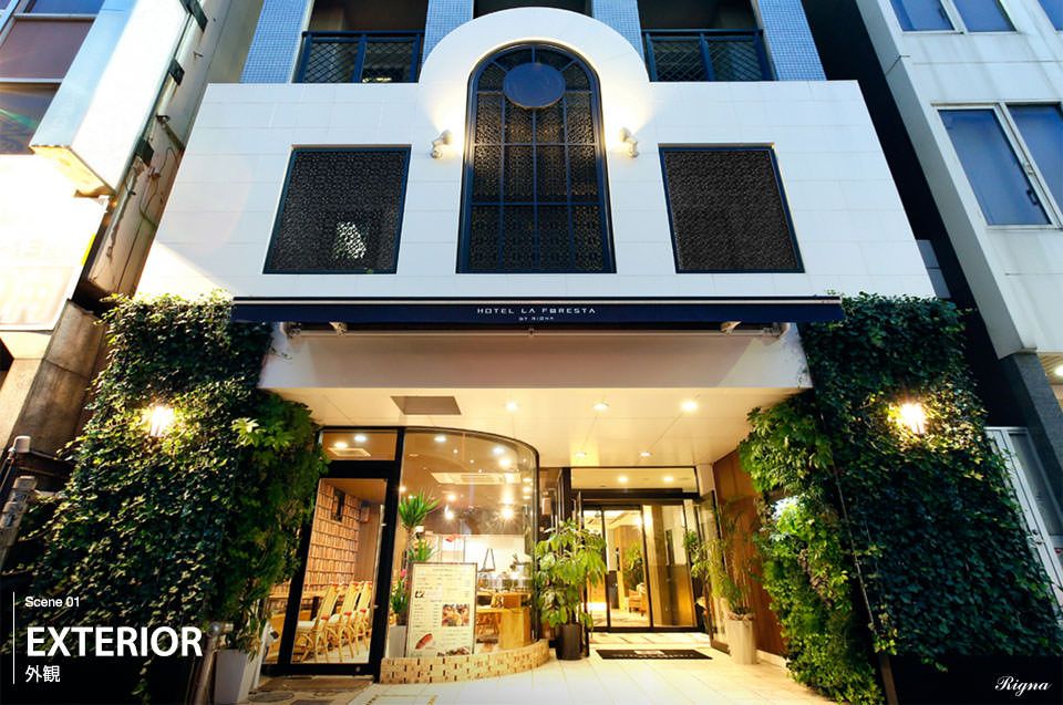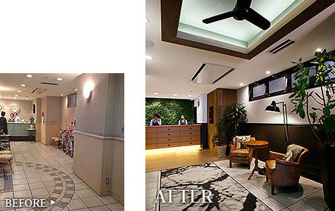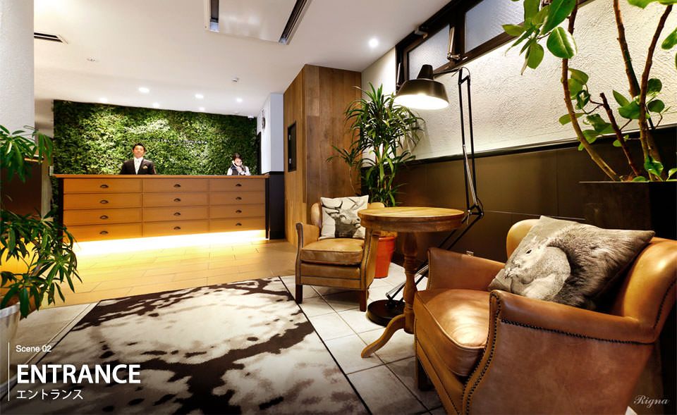 フロントの壁にもたっぷりと緑をあしらいました。生い茂る植物の中にはホテルのサインが。