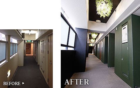 存在感とボリューム感のある壁面緑化を両サイドに施した正面外観。無機質な町並みの中で、いい意味での「違和感」が際立ちます。