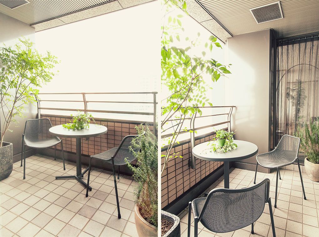 バルコニーにはテーブルセットとグリーンで屋外カフェのような雰囲気を。