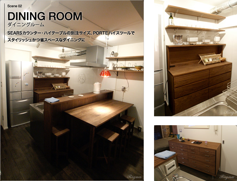 SEARSカウンター・ハイテーブルの別注サイズ PORTE ハイスツールでスタイリッシュかつ省スペースなダイニングに 食事はもちろんのこと、夜のお酒を交わす時間や早朝のメールチェックなどのちょっとした作業にも