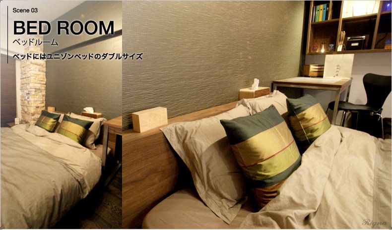 一日の疲れをとるユニゾンベッド奥の書斎スペースにはWINデスクのヘアラインスチールとウォールナット素材の組合せが出来るデキル大人風!