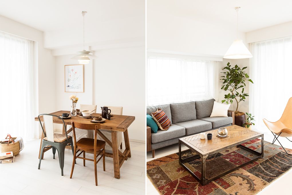 壁・床・天井、シアーカーテンなどの内装・窓まわり部分は全て白で統一され、清潔感を保ちつつ、ジャンク・インダストリアル系アイテムのもつ豊かな素材感を楽しめるインテリアとなりました。