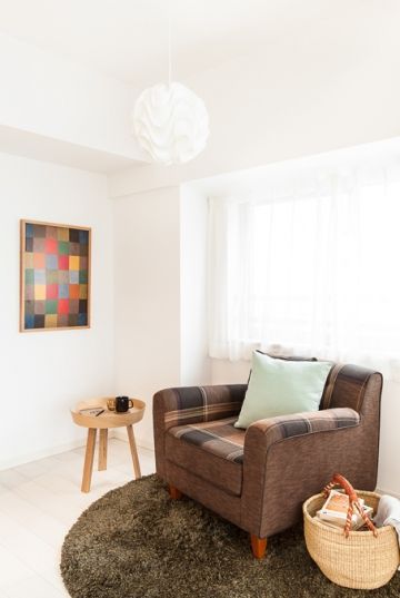 ポイントで差したアートとグリーンが、ミニマルなインテリアを程よく賑わせる引き立て役として効いています。
