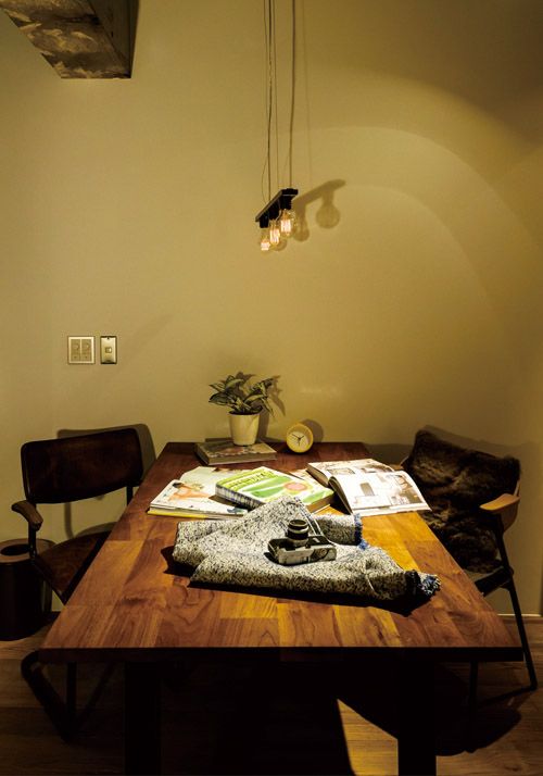 キッチンに近いこの場所はお部屋の核となる場所です。打合せ時にはコーヒーも出しやすく、棚のそばなので資料も取り出しやすい。その為の大きなテーブルなのです。そして吊るされたエジソンランプがオトコ心をくすぐります。