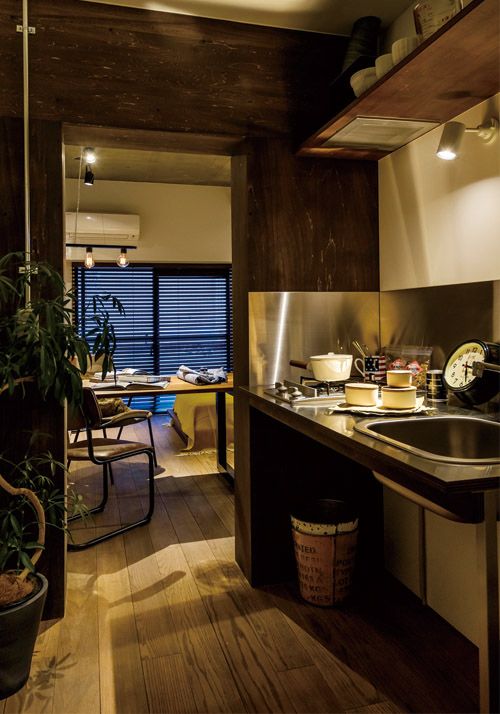 キッチンスペースは玄関ともお部屋とも床続きの場所なので、出来るだけシンプルに。1鉢グリーンを置き、インダストリアルなアイテムを混ぜればお部屋との一体感も出て見栄えします。