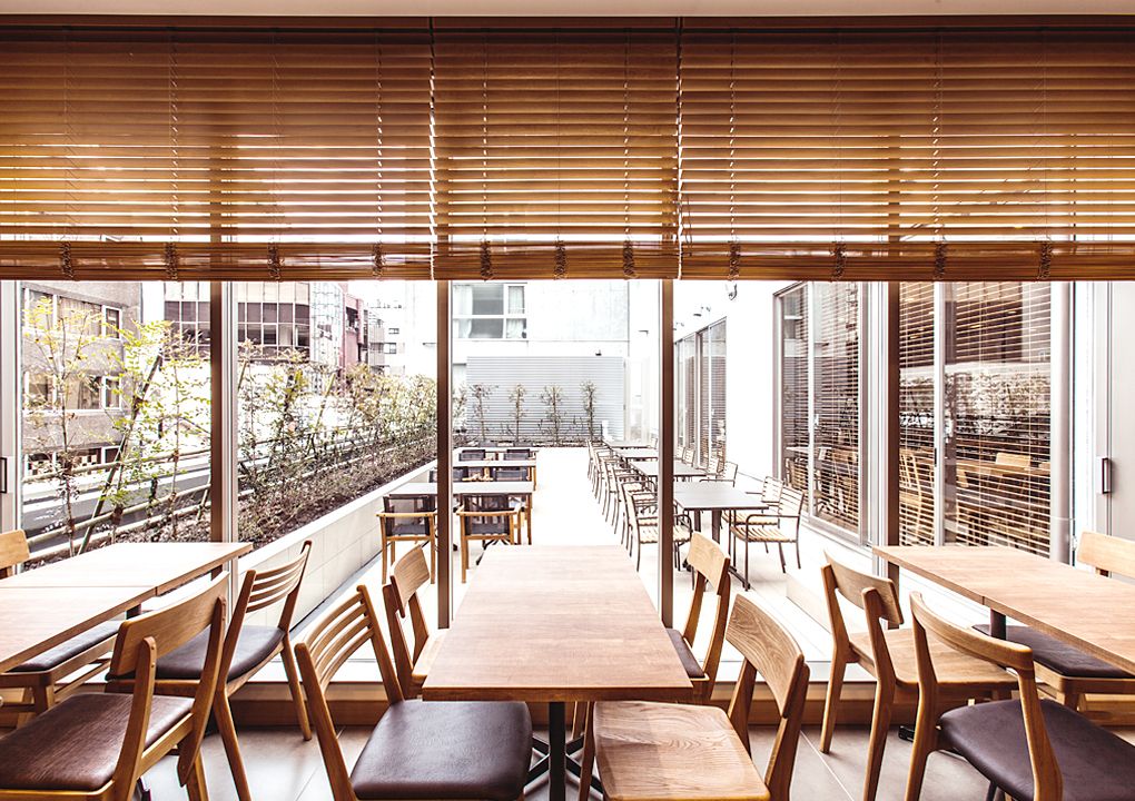 ここにも木を使ったデザインの屋外用家具をレイアウトし、カフェスペースとつながりを持たせるとともに、都心の空気を感じさせない雰囲気に仕上げました。