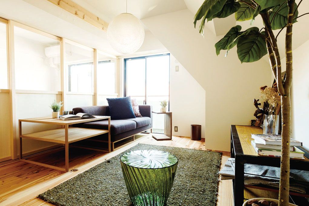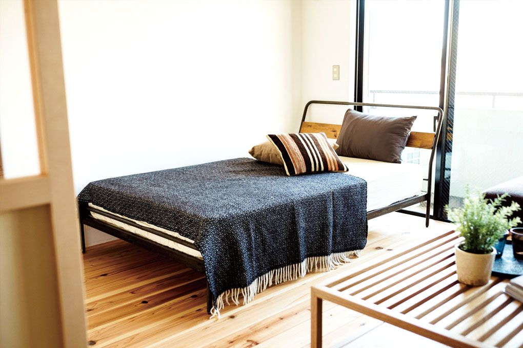 直線的なデザインを取り入れたジャパニーズモダンなゆったりソファ、スチールを使ったベッドフレーム。こうした「かっちり」したアイテムも、テイストがマッチすることで巧く取り込めます。