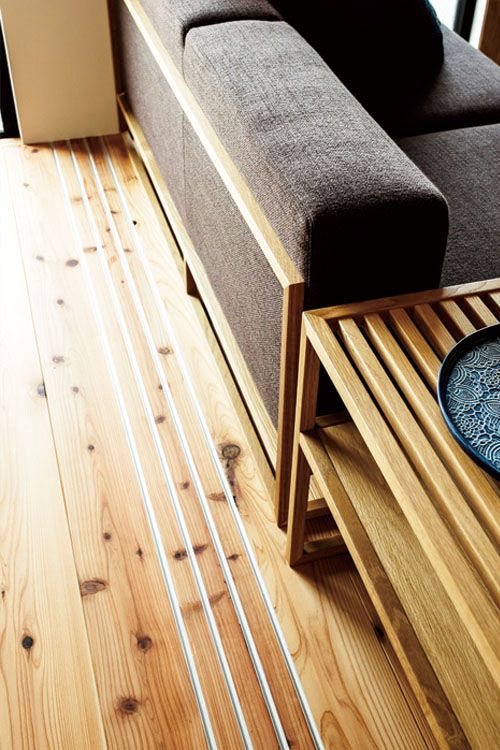 家具の意匠そして構造として表面に見えている直線。間仕切りを移動させるための床のレール。この感じ、気持ちいいです。交わる事の無い平行線は、今回のコーディネートにおけるさりげないチャームポイント。