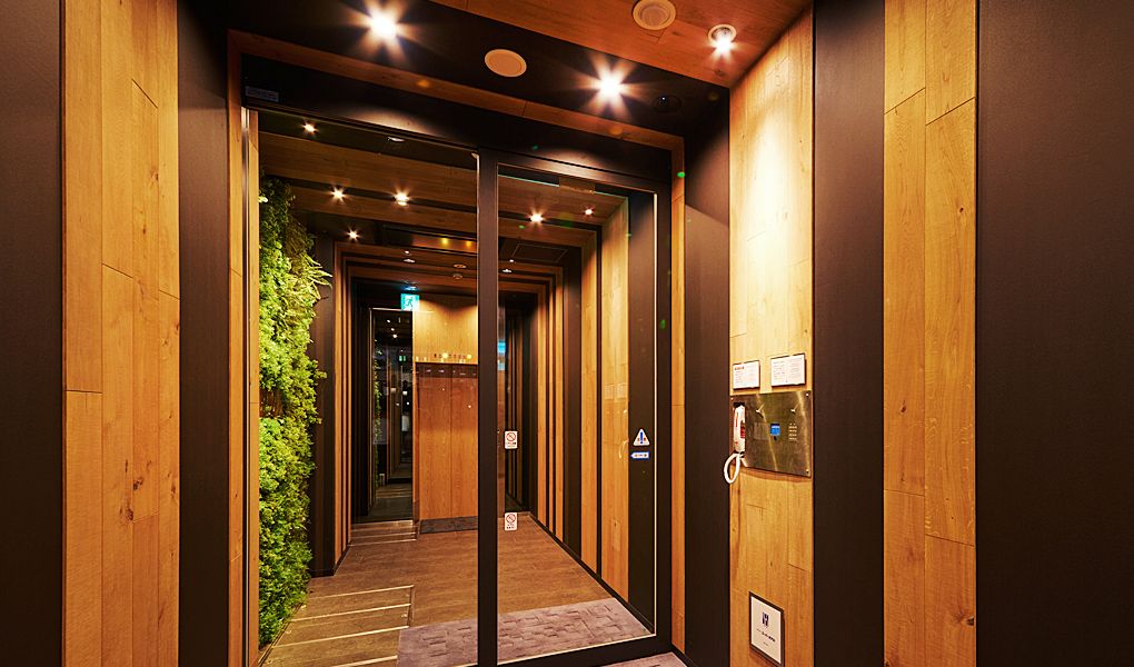 エレベーターに通じる狭い通路も、外観のゲートのデザインと繋がりをもたせ、三方を囲う木目をランダムに配置するデザインとしました。明るい木目と黒でコントラストをつけ、空間の狭さを解消し奥行を感じられるものにしました。