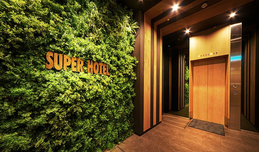 エレベーター横には、スーパーホテルが掲げるLohasというテーマにはふさわしい、緑の装飾を施しました。