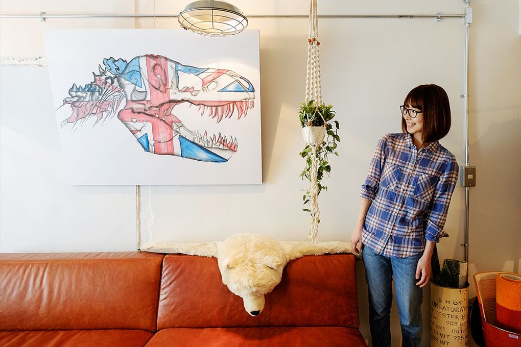 恐竜の骨に描かれたユニオンジャックは、ジャンクなお部屋との相性もバッチリです。